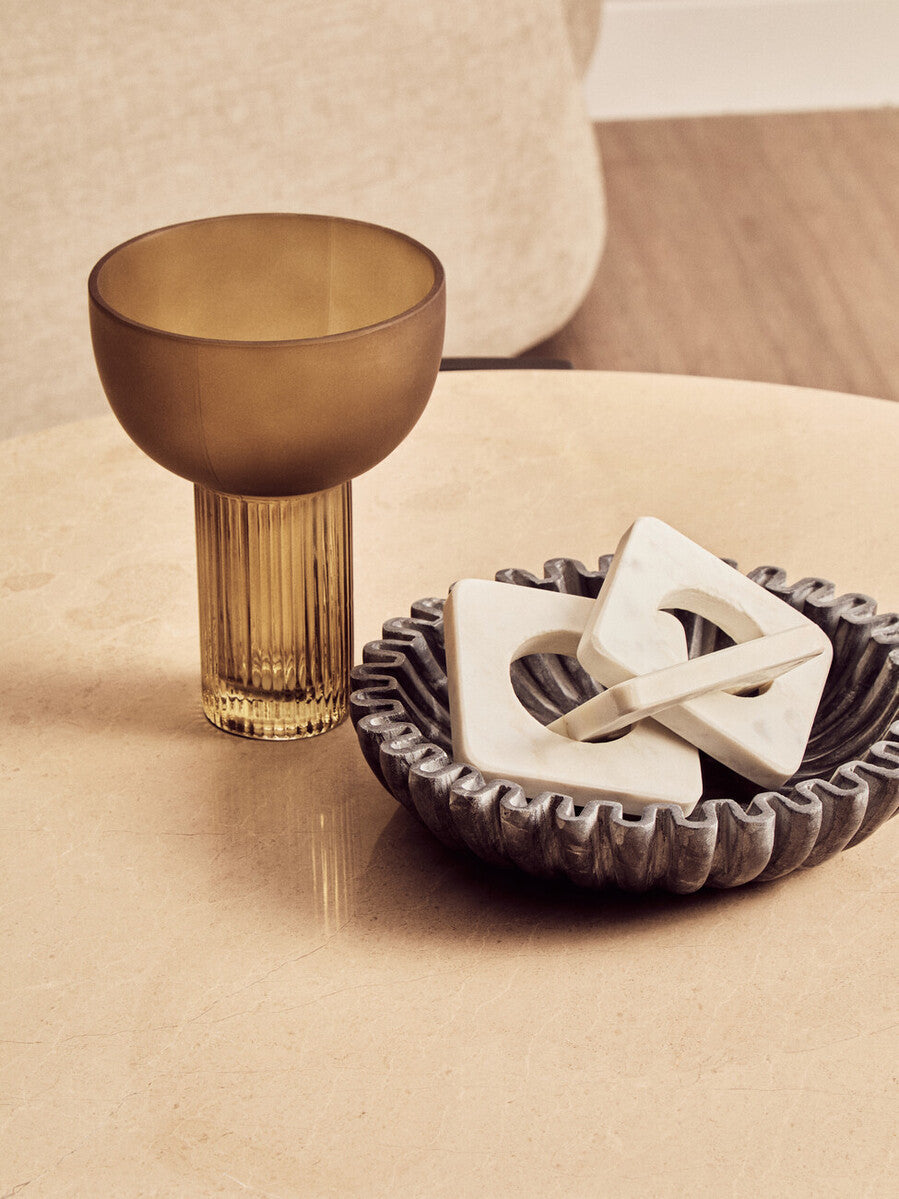 Layer a natural fiber rug beneath this round cream marble coffee table to enhance its warmth, then add a low bowl, a scented candle, and your favorite hardcover for a curated, designer-led look.