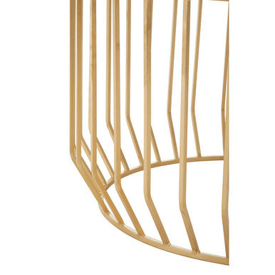 This coffee table has a smooth white marble top supported by a gold finish iron base that gives it a luxe appearance. The base has a sleek wireframe with thin wires forming a cage design that contributes to its minimalist appearance.