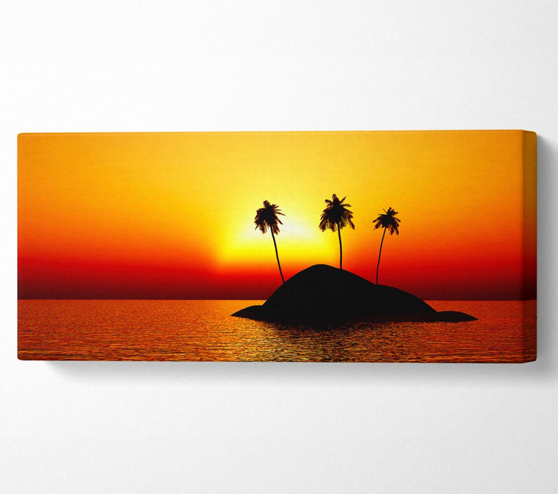 Palmtree Island At Sunset canvas, printed on coated polyester canvas. Mounted on to a 44mm box frame, ready to hang.