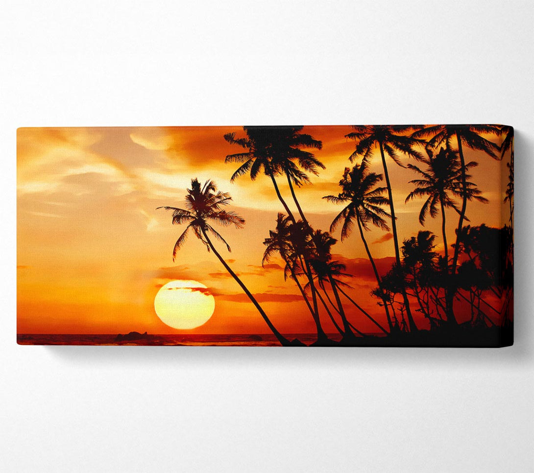 Palmtree Sunset Over The Ocean canvas, printed on coated polyester canvas. Mounted on to a 44mm box frame, ready to hang.