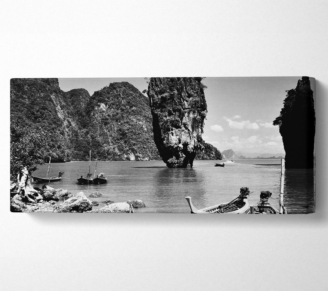 Paradise Island Boats B n W canvas, printed on coated polyester canvas. Mounted on to a 44mm box frame, ready to hang.