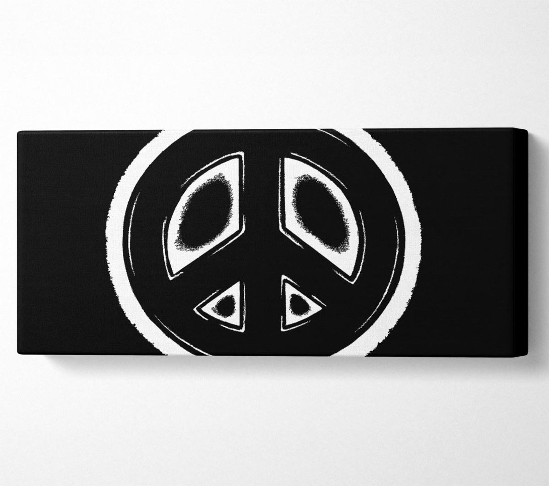 Peace Sign White On Black canvas, printed on coated polyester canvas. Mounted on to a 44mm box frame, ready to hang.