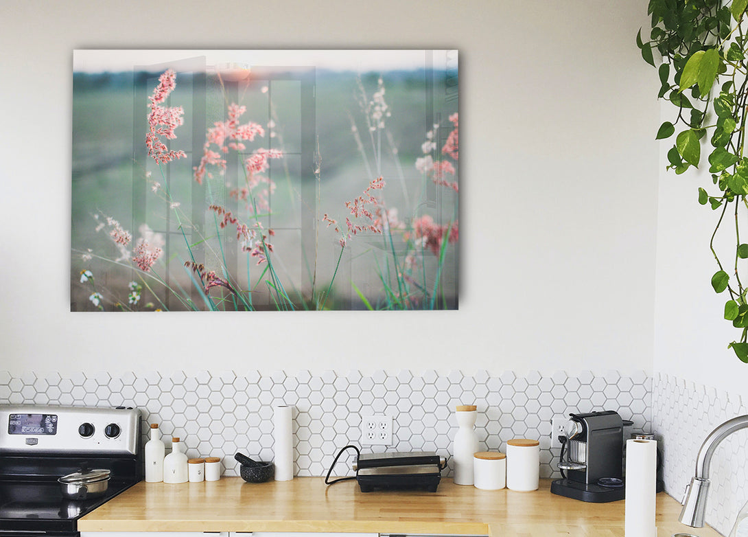 Peach coloured flowers in the morning meadow acrylic print, UV printed onto 5mm thick acrylic glass. Comes with everything you need to hang on your wall.