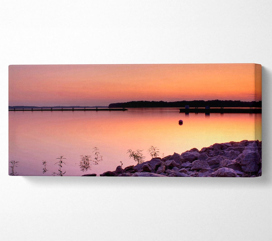 Peach Lake Calm canvas, printed on coated polyester canvas. Mounted on to a 44mm box frame, ready to hang.