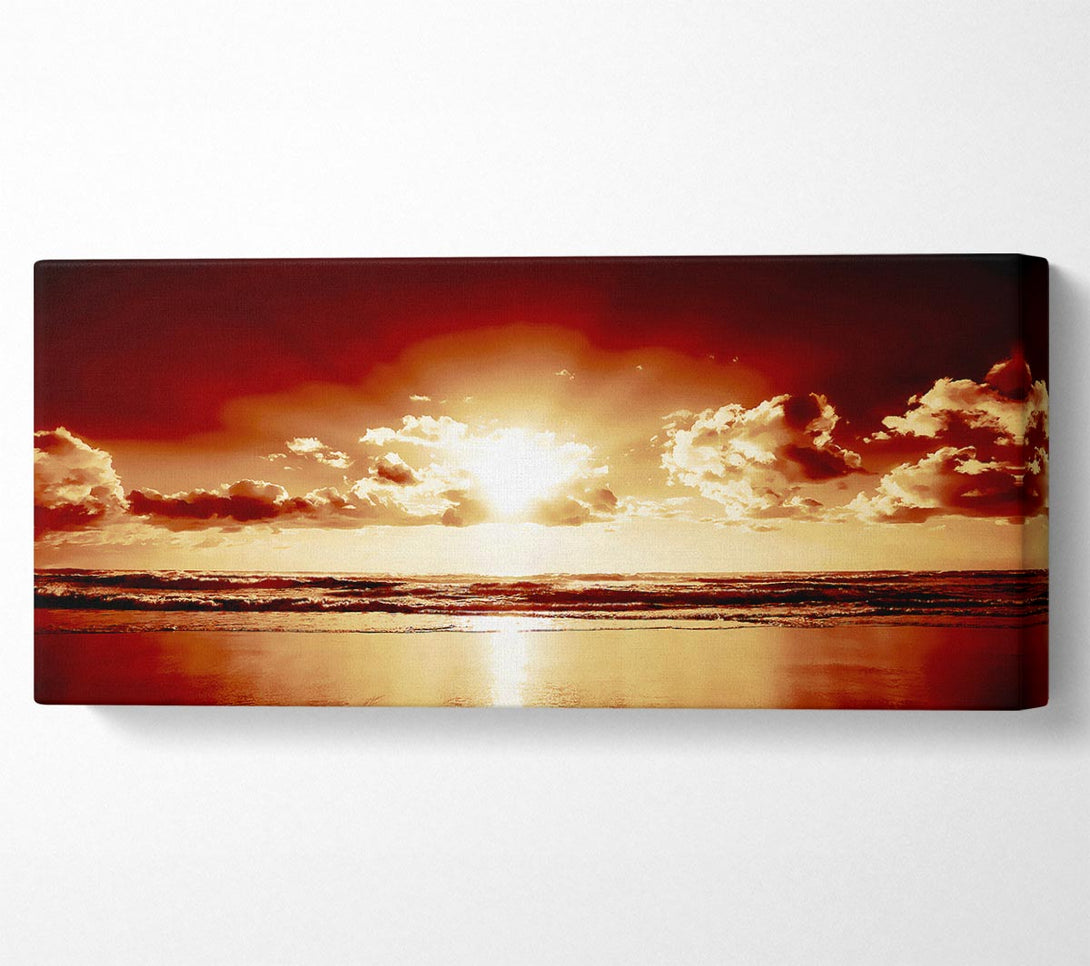 Peach Ocean Sunrise canvas, printed on coated polyester canvas. Mounted on to a 44mm box frame, ready to hang.