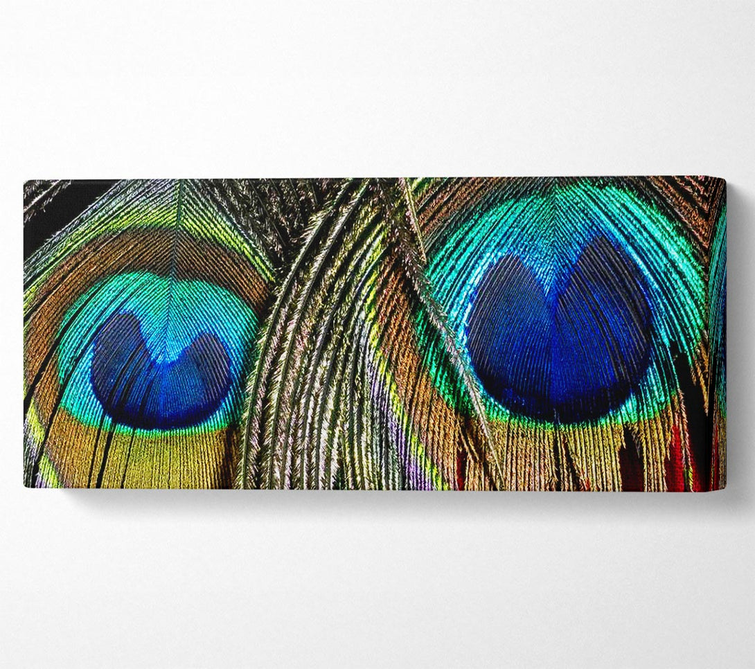 Peacock Feather Duo canvas, printed on coated polyester canvas. Mounted on to a 44mm box frame, ready to hang.