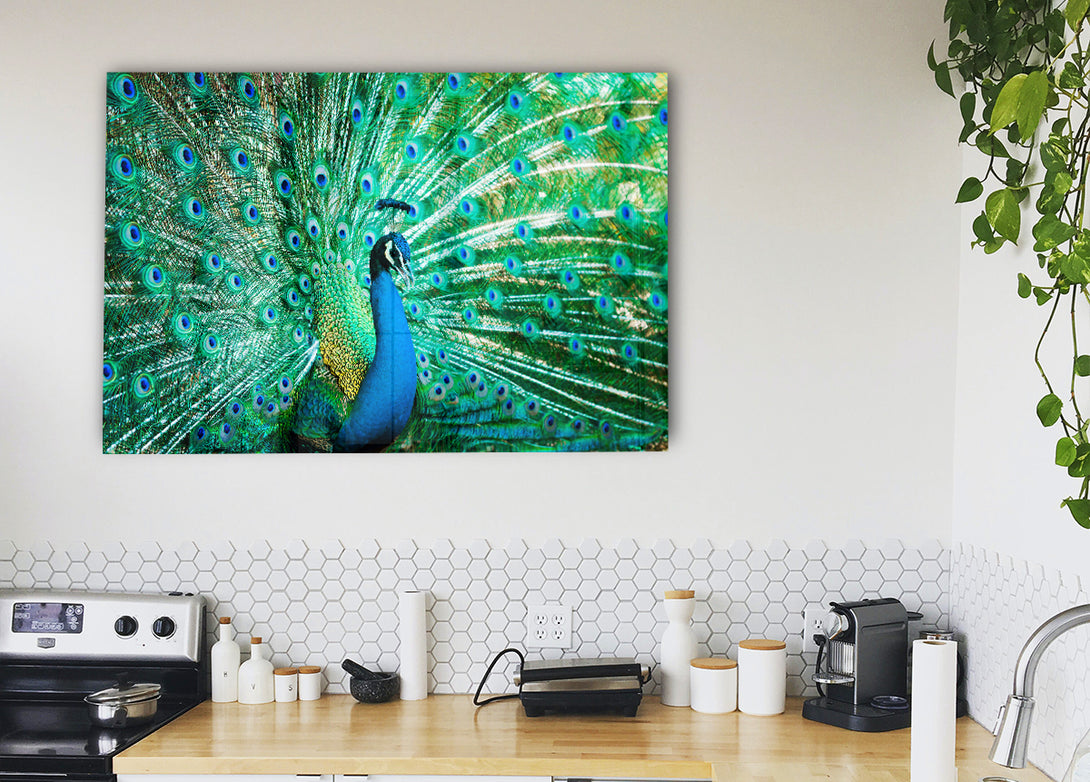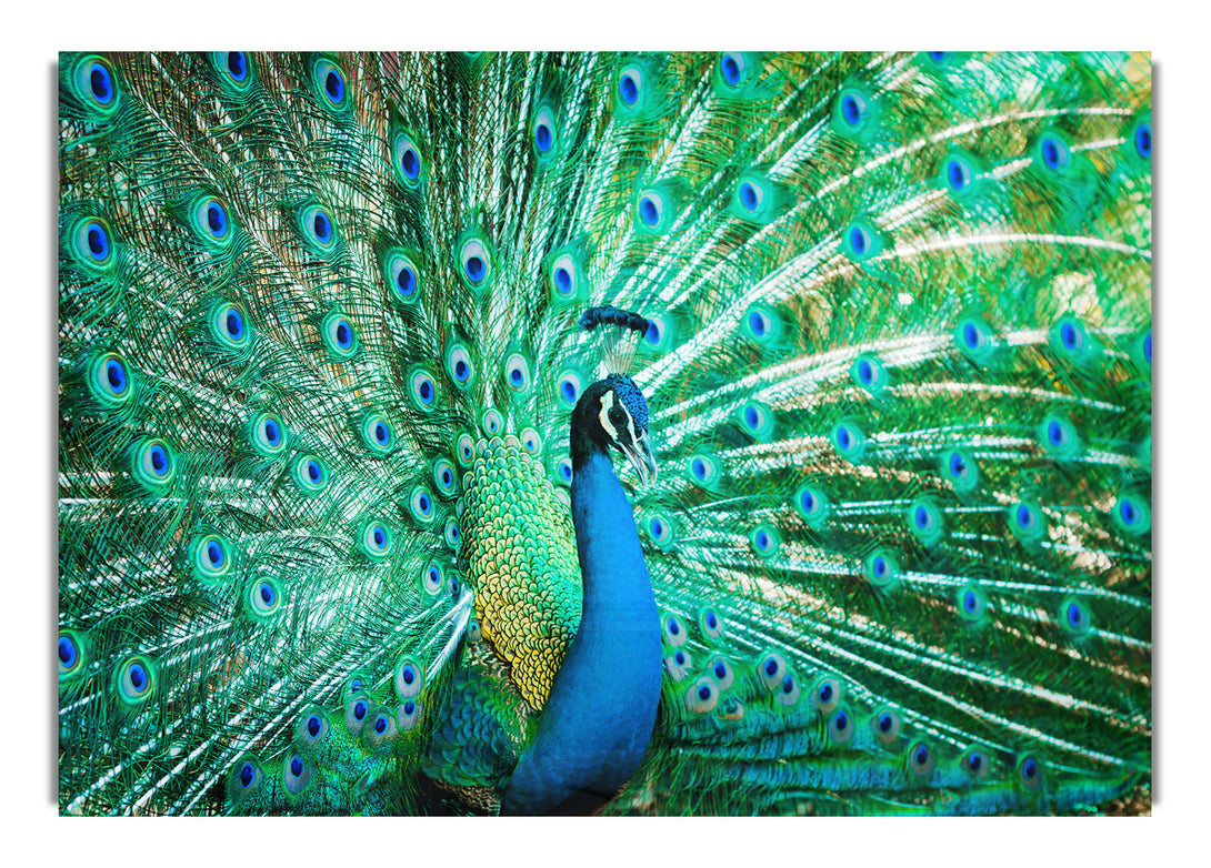 Peacock Feather Glory acrylic print, UV printed onto 5mm thick acrylic glass. Comes with everything you need to hang on your wall.