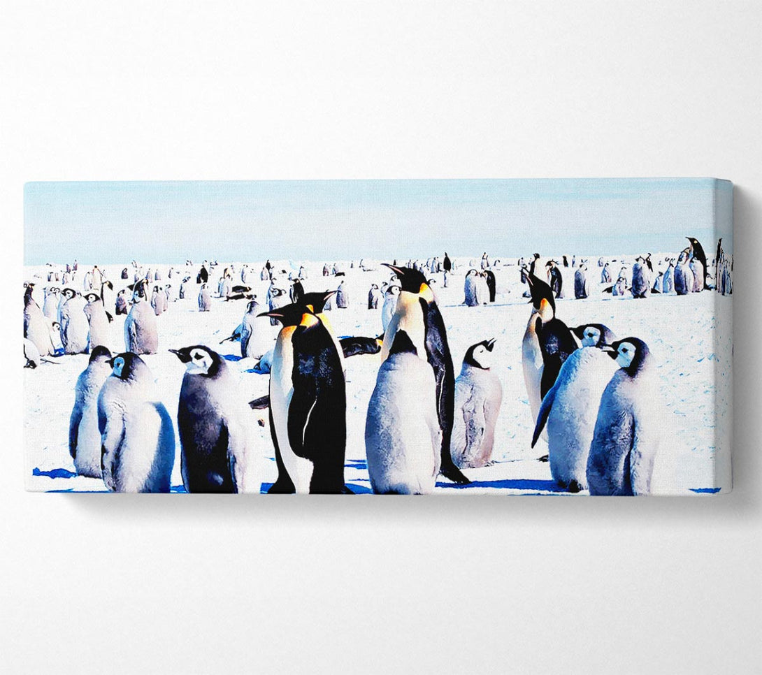 Penguin Meeting Place canvas, printed on coated polyester canvas. Mounted on to a 44mm box frame, ready to hang.