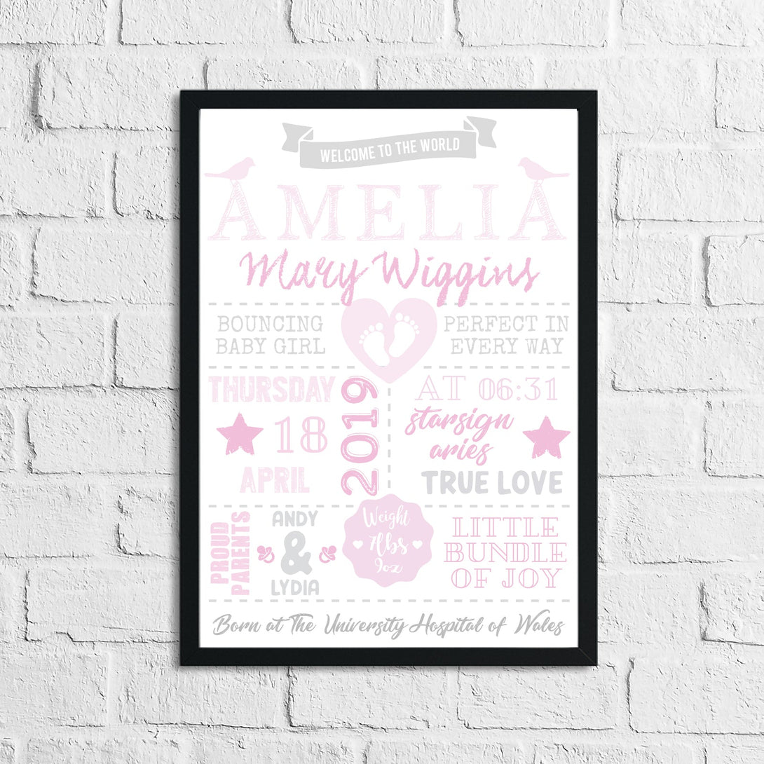 Personalised Baby Girl's Birth Pink Children's Bedroom Room Wall Decor Print