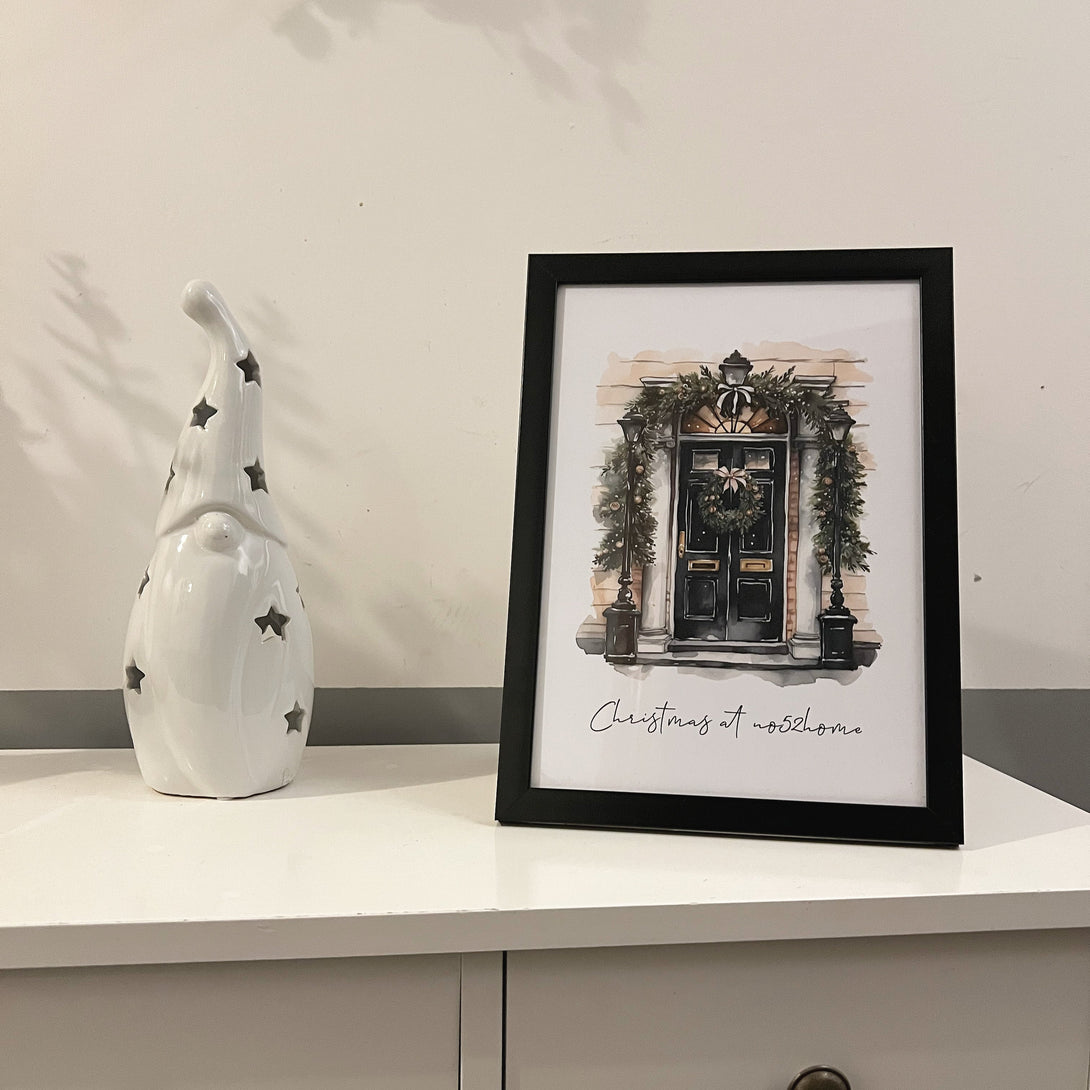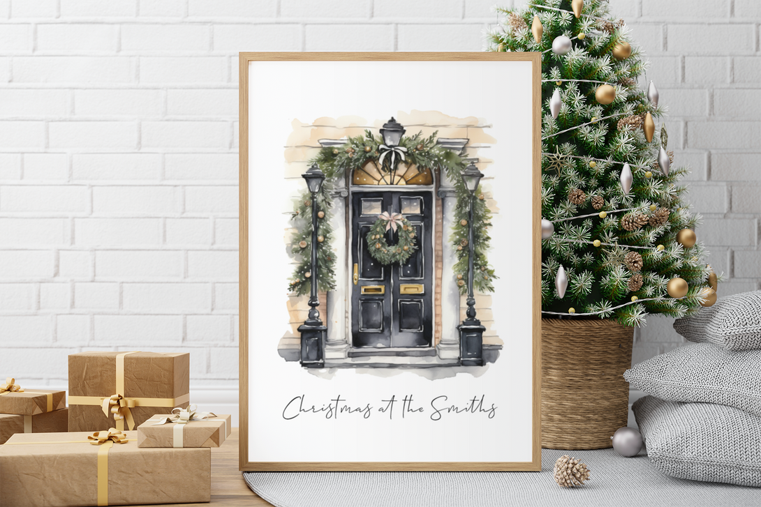 Personalised Christmas At Surname Black Front Door Winter Christmas Seasonal Wall Home Decor Print