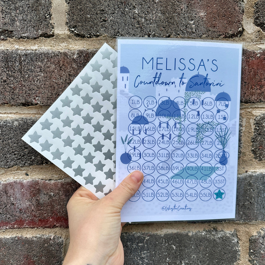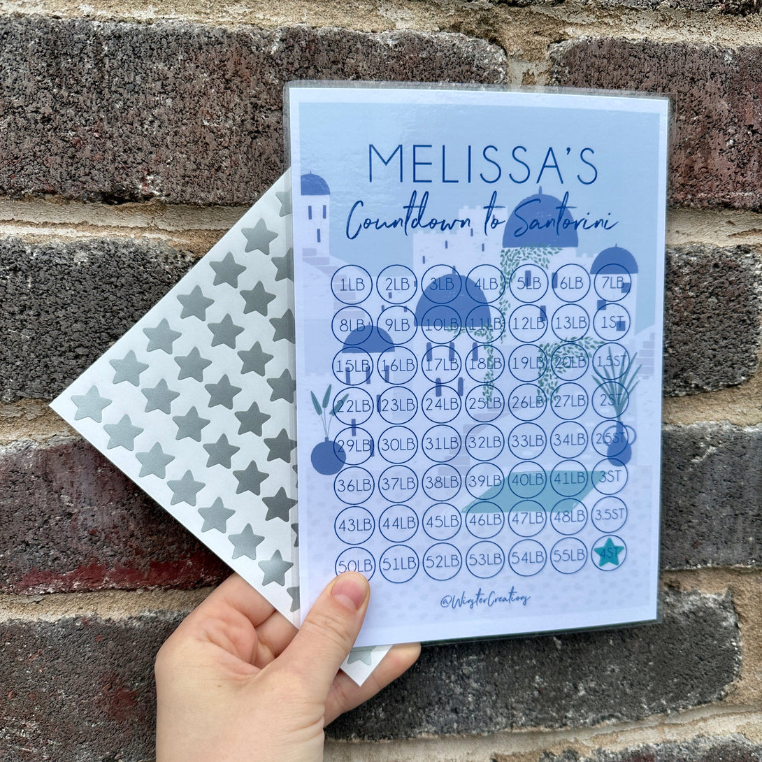 Personalised Name Countdown To Santorini Holiday Weight Loss Diet Slimming Chart Tracker Print - Laminated With Stars