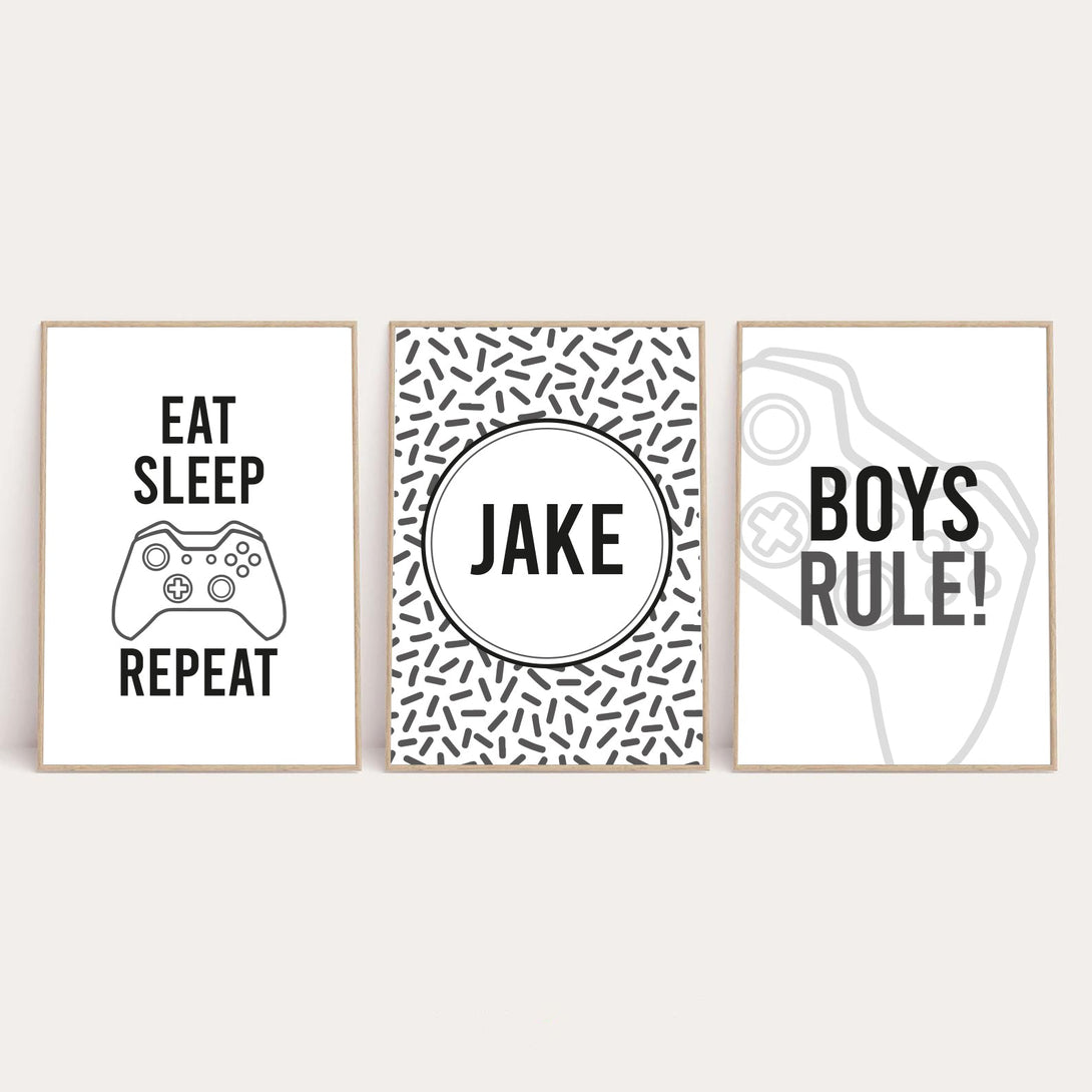 Personalised Name Gamer Eat Sleep Game Repeat Children's Wall Decor Set Of 3 Prints