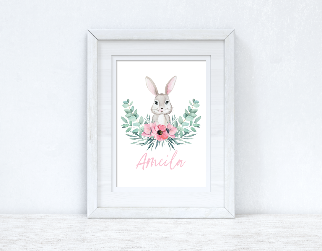 Personalised Pink Wording Floral Bunny Easter Spring Seasonal Wall Home Decor Print
