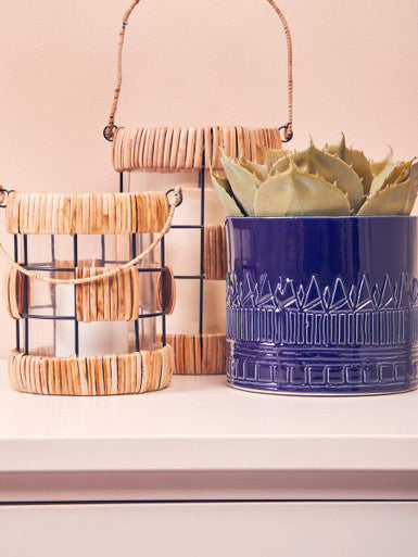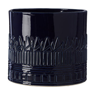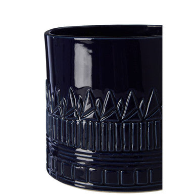 This planter is skilfully made from smooth glazed ceramic in a deep blue finish. Boasting a variety of tribal-esque embossed patterns across two-thirds of the body, this planter will make a visual statement in the living area.