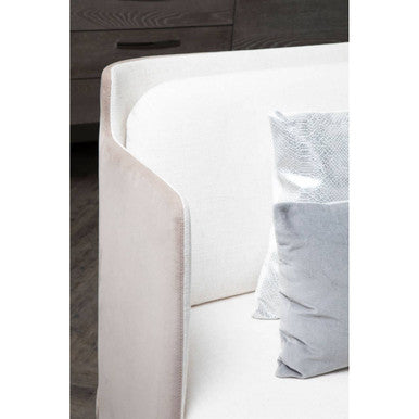 Upholstered in white fabric, this two seater sofa features a thick padded seat with matching cushions. It has a simple profile with a curved back in a muted shade which contrasts the soft white hues. Sleek silver finish metal legs give the overall, understated design a metallic edge.