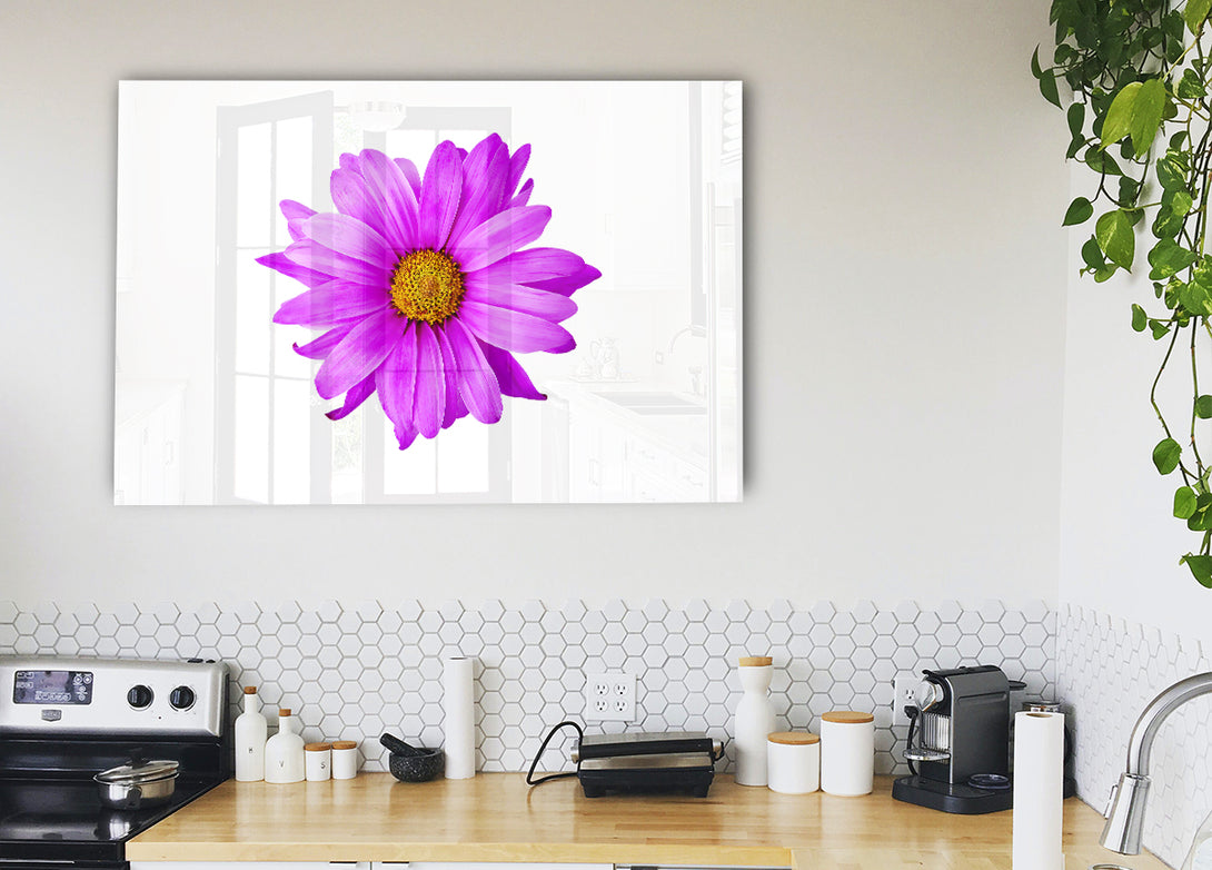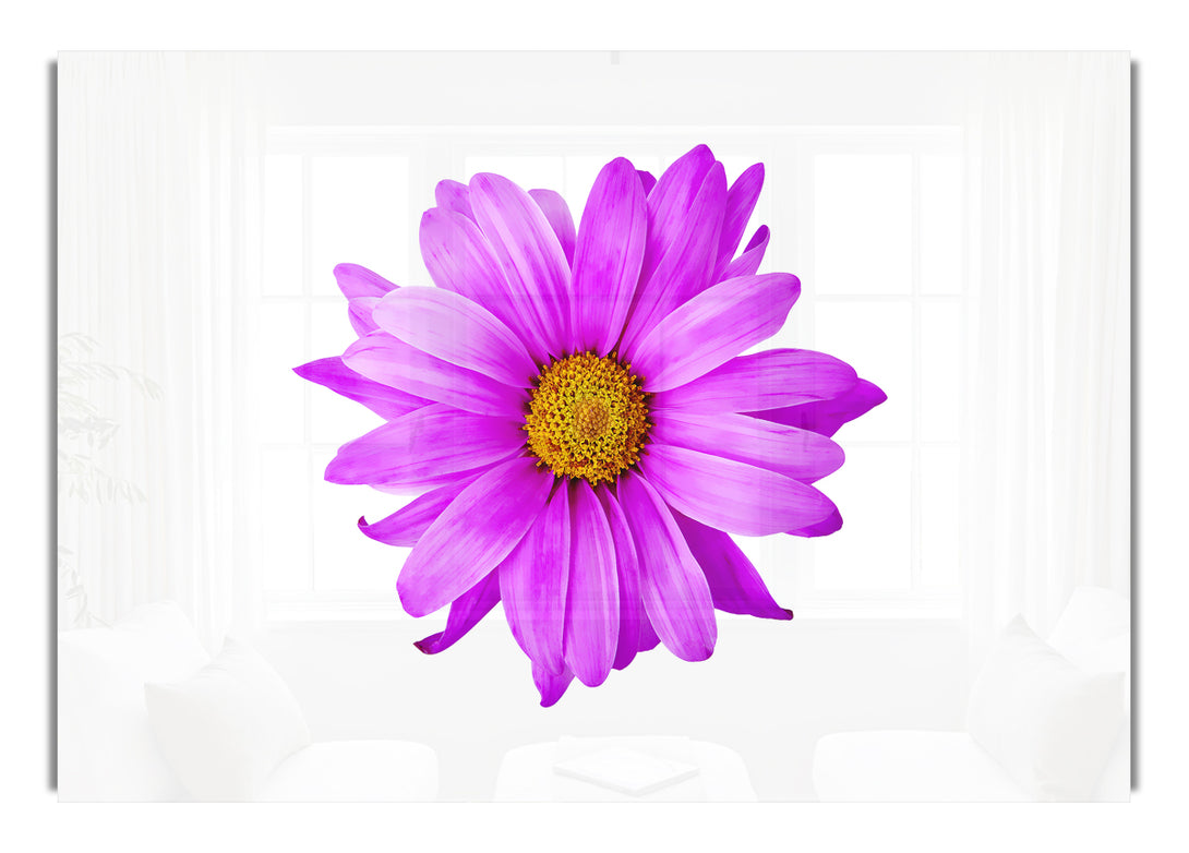 Pink Daisy On White acrylic print, UV printed onto 5mm thick acrylic glass. Comes with everything you need to hang on your wall.