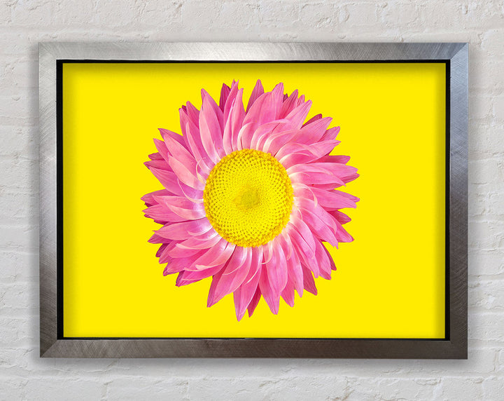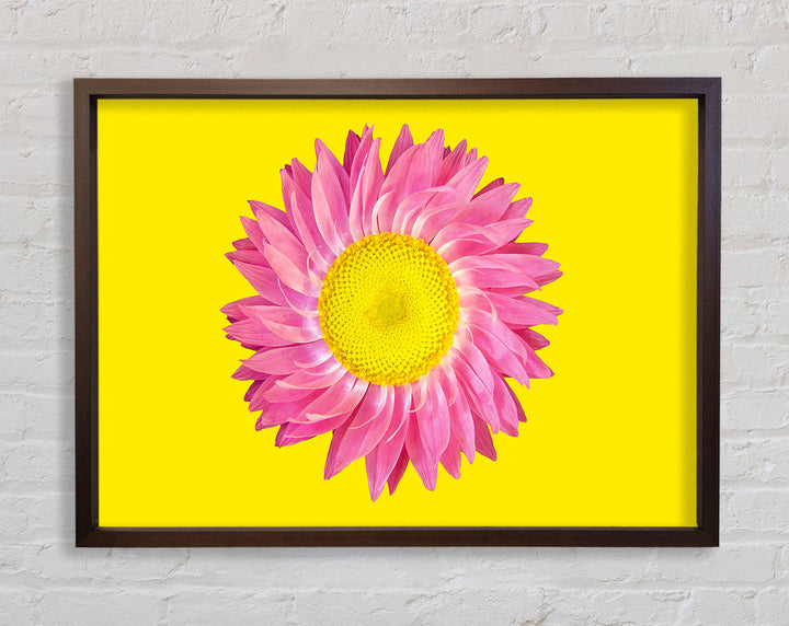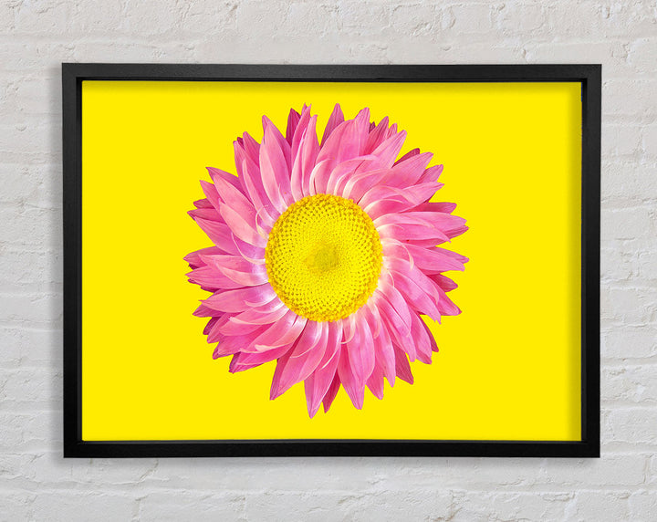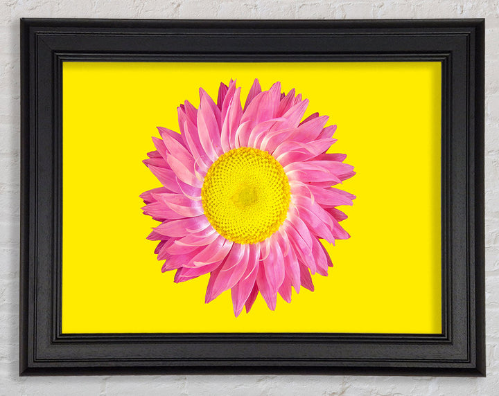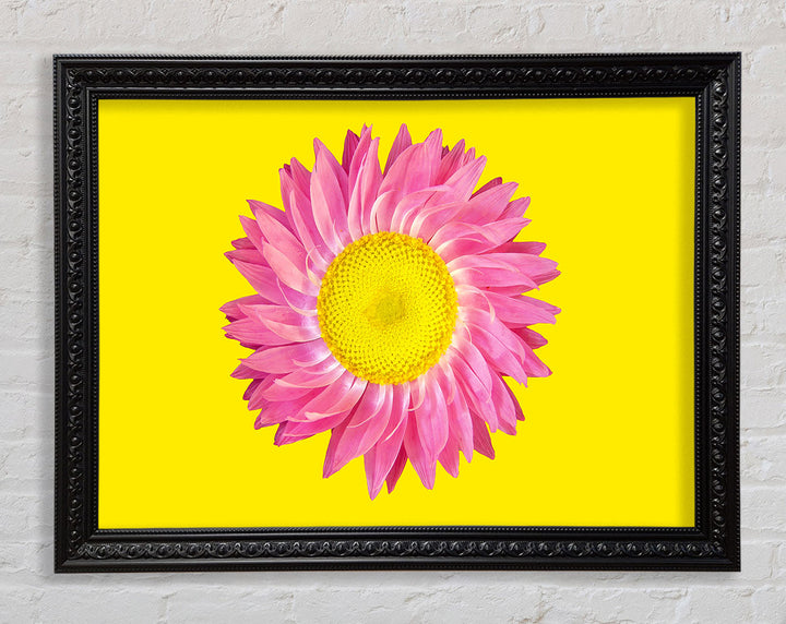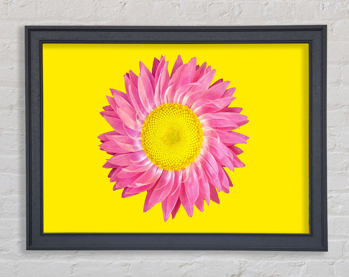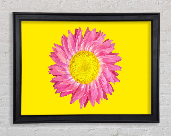 Brighten up any space with the Pink Daisy On Yellow Twist Framed Print. This stunning framed art showcases a vibrant pink daisy set against a lively yellow background, creating a cheerful and eye-catching piece. Each print is handmade in the United Kingdom, ensuring exceptional quality and attention to detail.