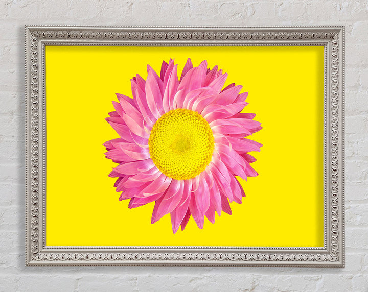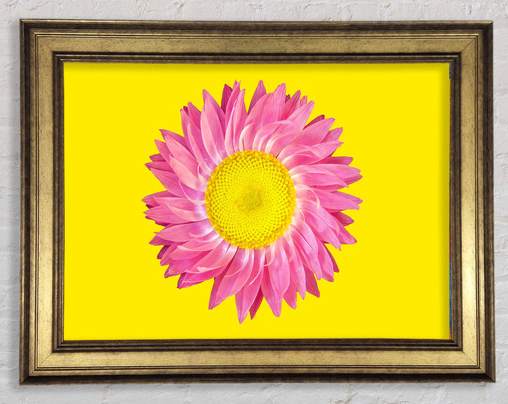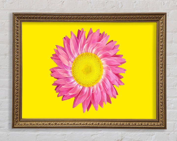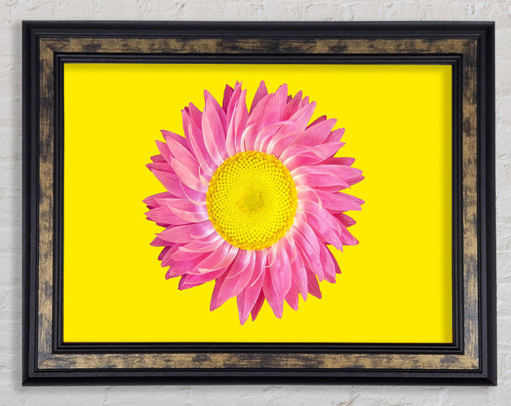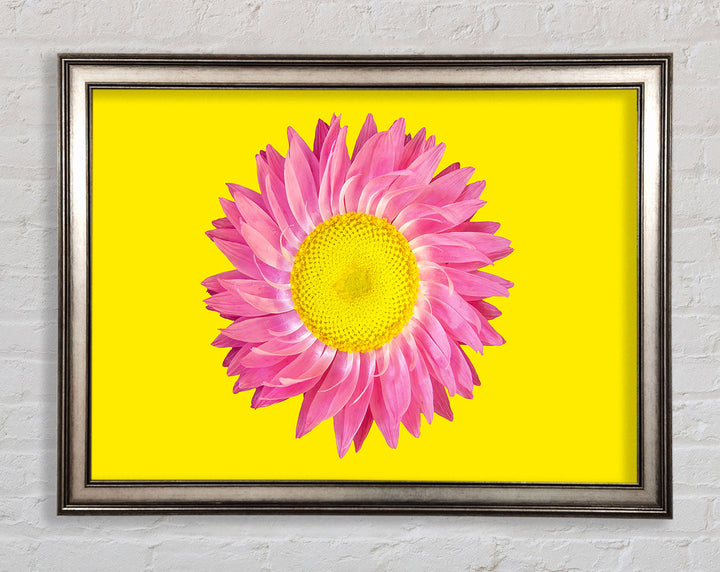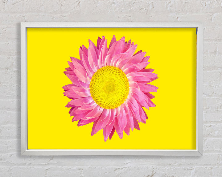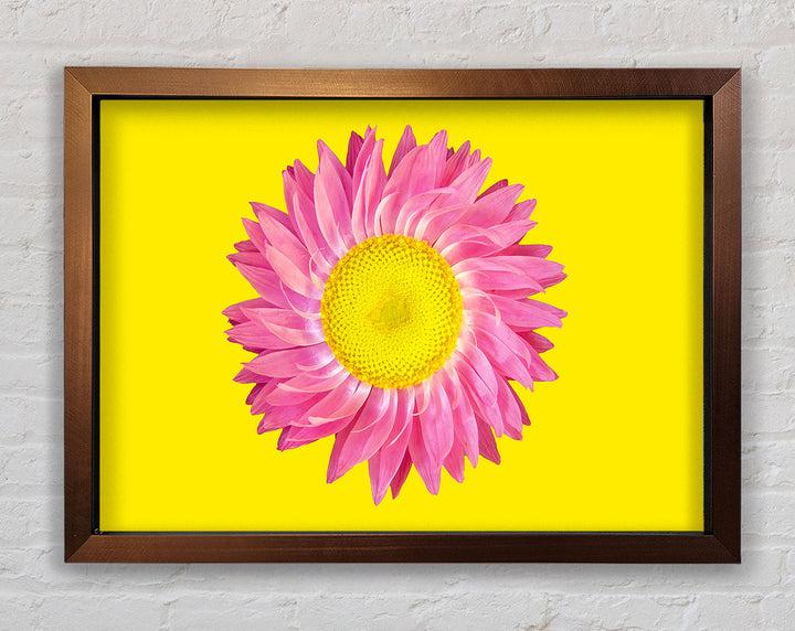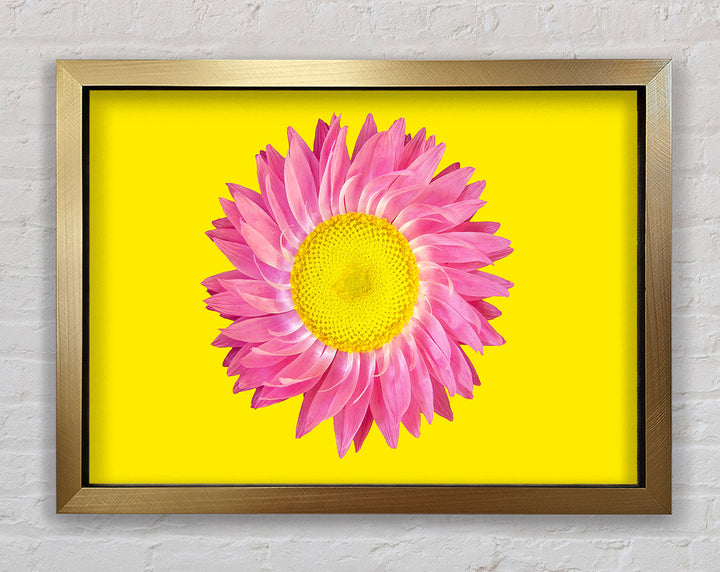 Brighten up any space with the Pink Daisy On Yellow Twist Framed Print. This stunning framed art showcases a vibrant pink daisy set against a lively yellow background, creating a cheerful and eye-catching piece. Each print is handmade in the United Kingdom, ensuring exceptional quality and attention to detail.