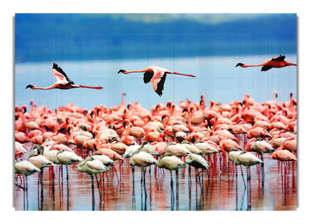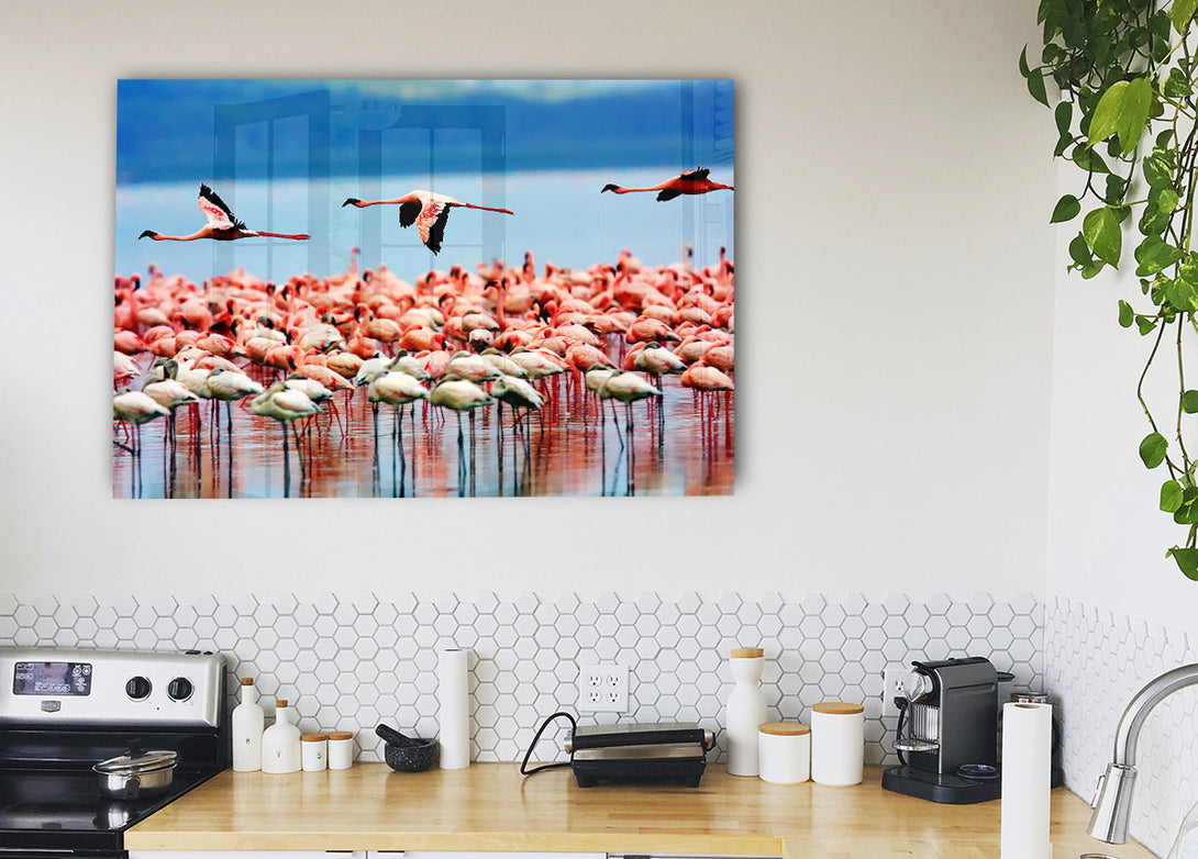 Pink Flamingos In Flight acrylic print, UV printed onto 5mm thick acrylic glass. Comes with everything you need to hang on your wall.