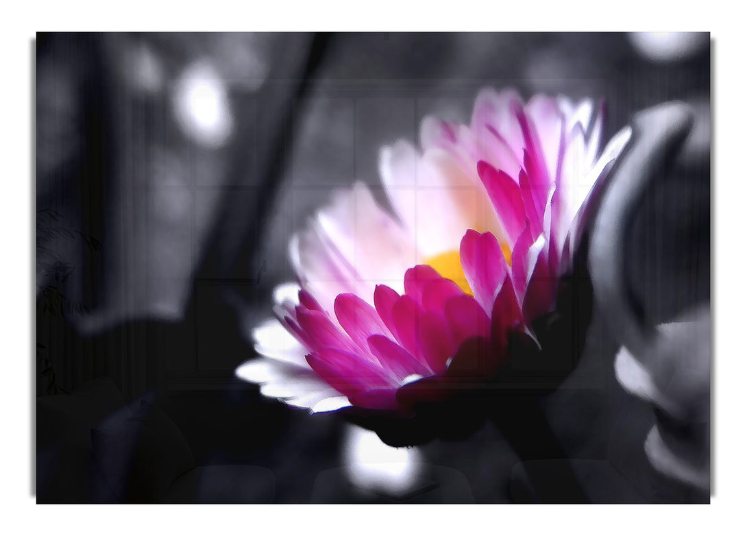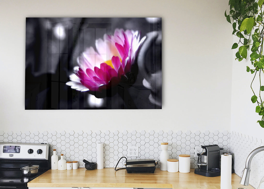 Pink Flower On Black And White Background acrylic print, UV printed onto 5mm thick acrylic glass. Comes with everything you need to hang on your wall.