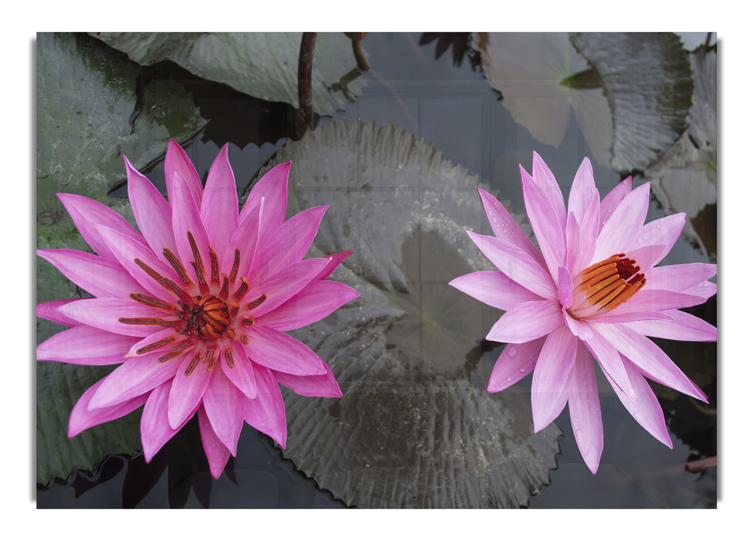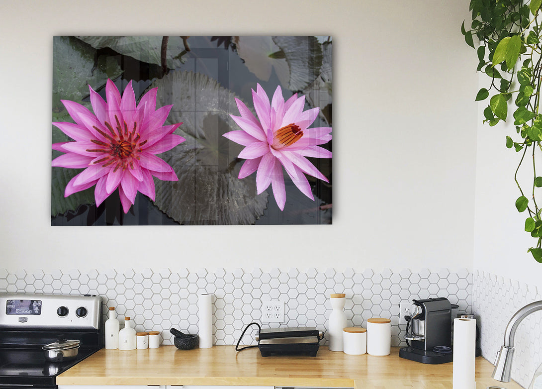 Pink flowers in the lake acrylic print, UV printed onto 5mm thick acrylic glass. Comes with everything you need to hang on your wall.