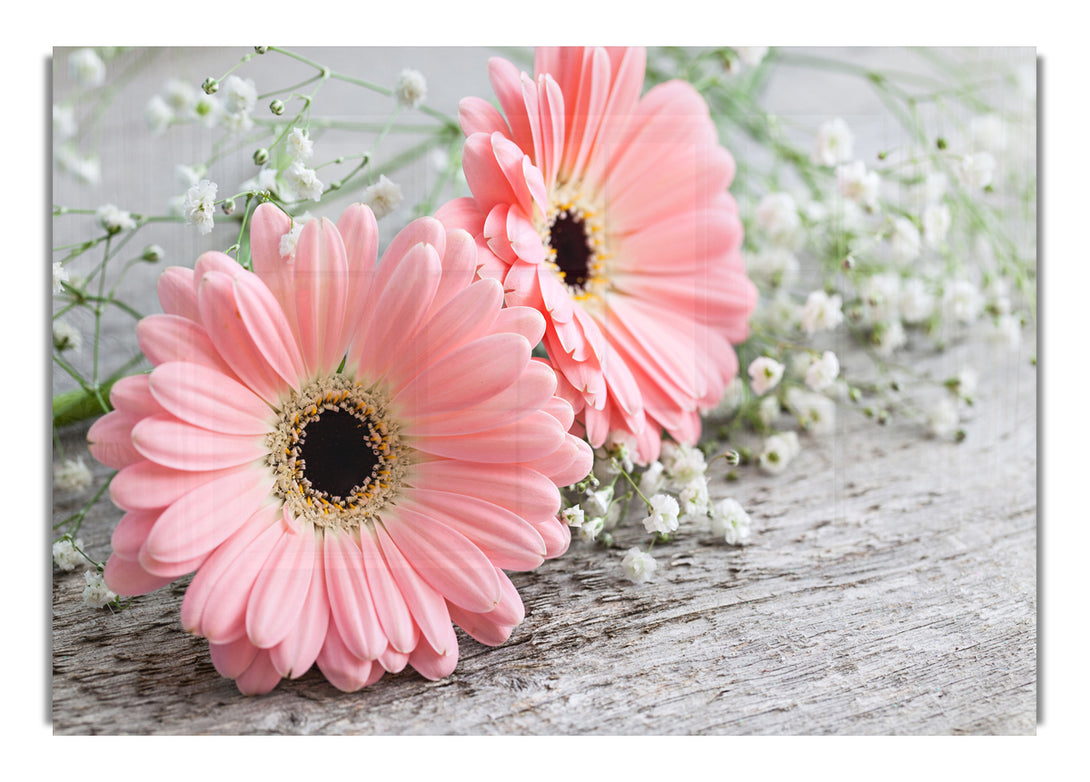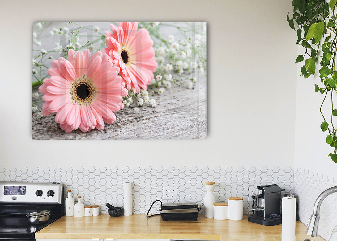 Pink gerbera laying down close acrylic print, UV printed onto 5mm thick acrylic glass. Comes with everything you need to hang on your wall.