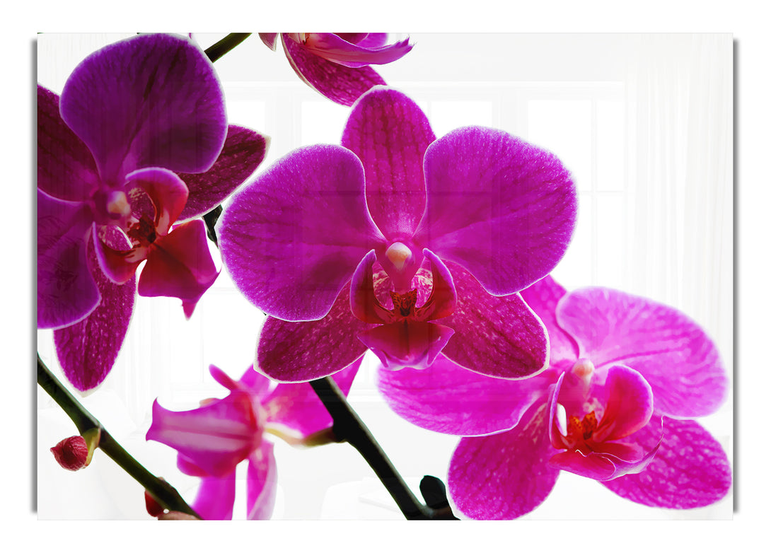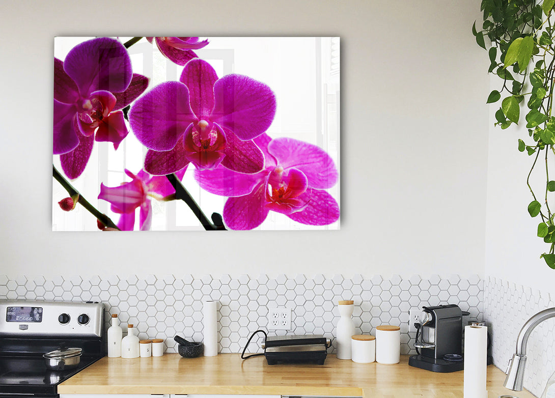 Pink Orchid Flowers Canvasb acrylic print, UV printed onto 5mm thick acrylic glass. Comes with everything you need to hang on your wall.