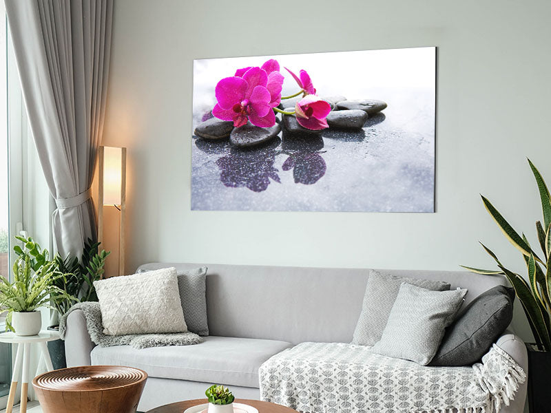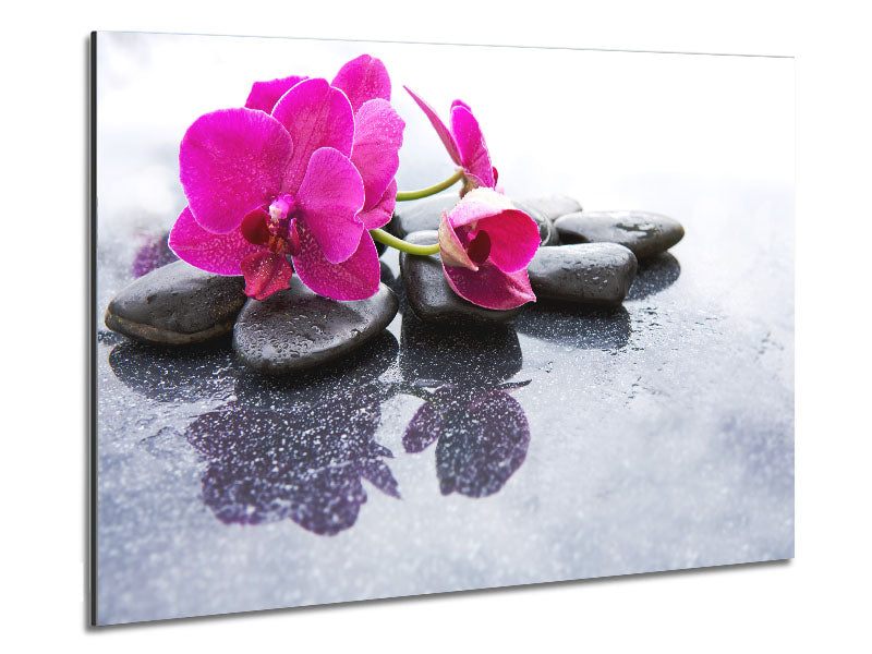 Pink orchid on the rocks Printed on brushed aluminium dibond. A modern way to display art and easy to maintain.