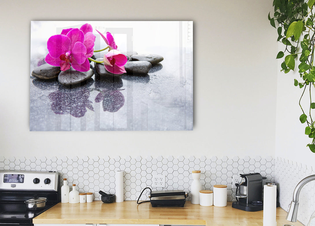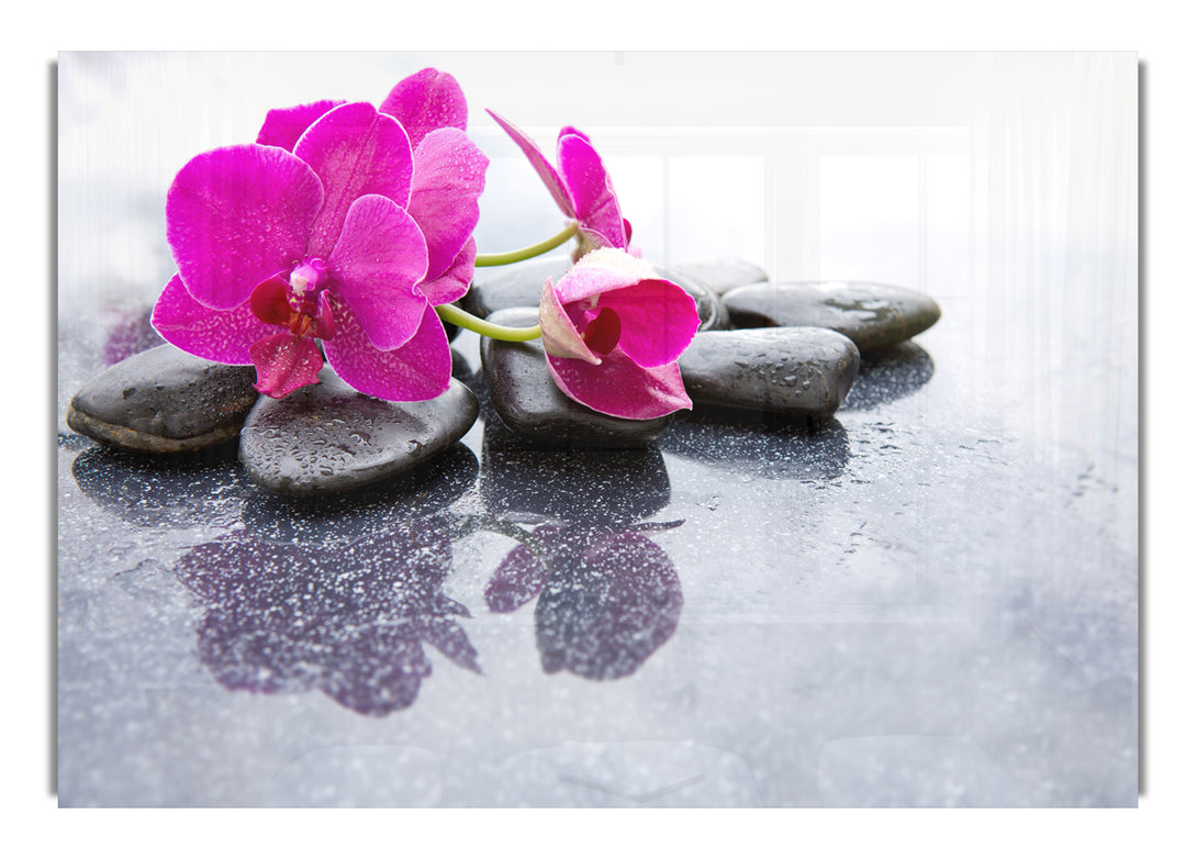 Pink orchid on the rocks acrylic print, UV printed onto 5mm thick acrylic glass. Comes with everything you need to hang on your wall.