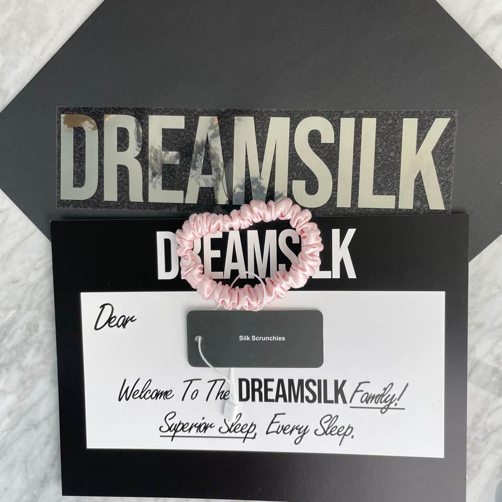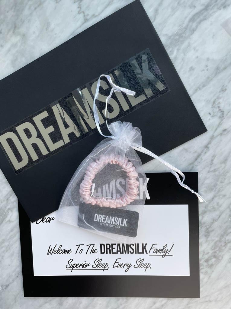 DREAMSILK's™ silk scrunchies that glide over your hair like moonlight over water.