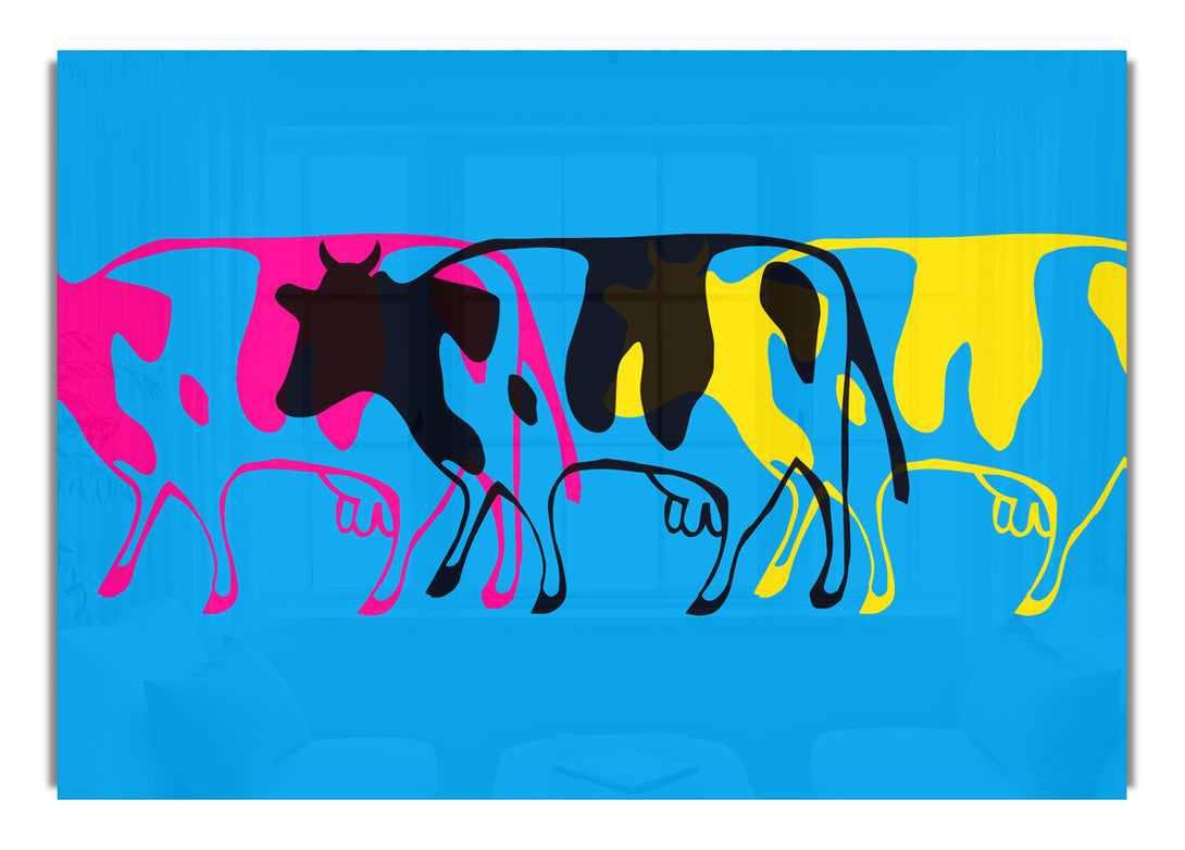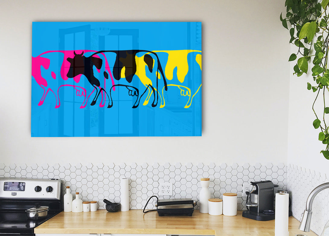 Pop Art Cows acrylic print, UV printed onto 5mm thick acrylic glass. Comes with everything you need to hang on your wall.