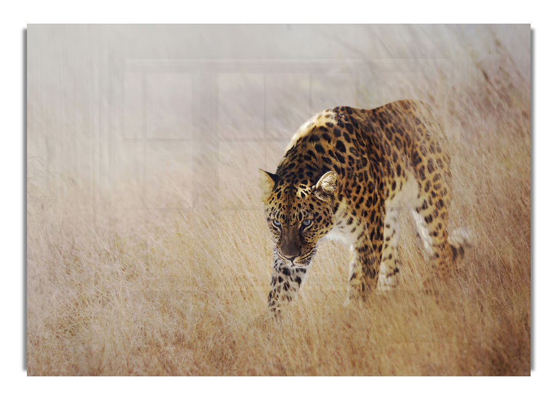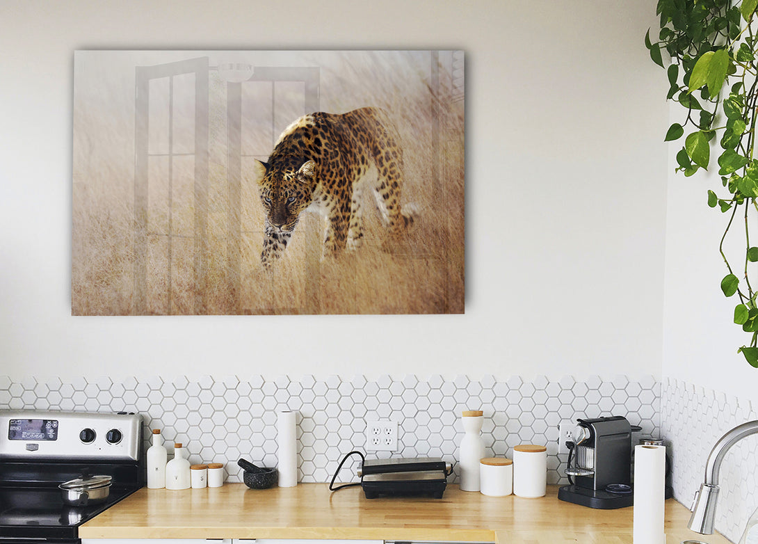 Prowling Leopard acrylic print, UV printed onto 5mm thick acrylic glass. Comes with everything you need to hang on your wall.