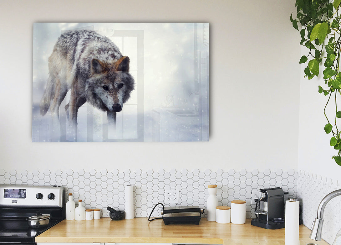 Prowling Wolf acrylic print, UV printed onto 5mm thick acrylic glass. Comes with everything you need to hang on your wall.