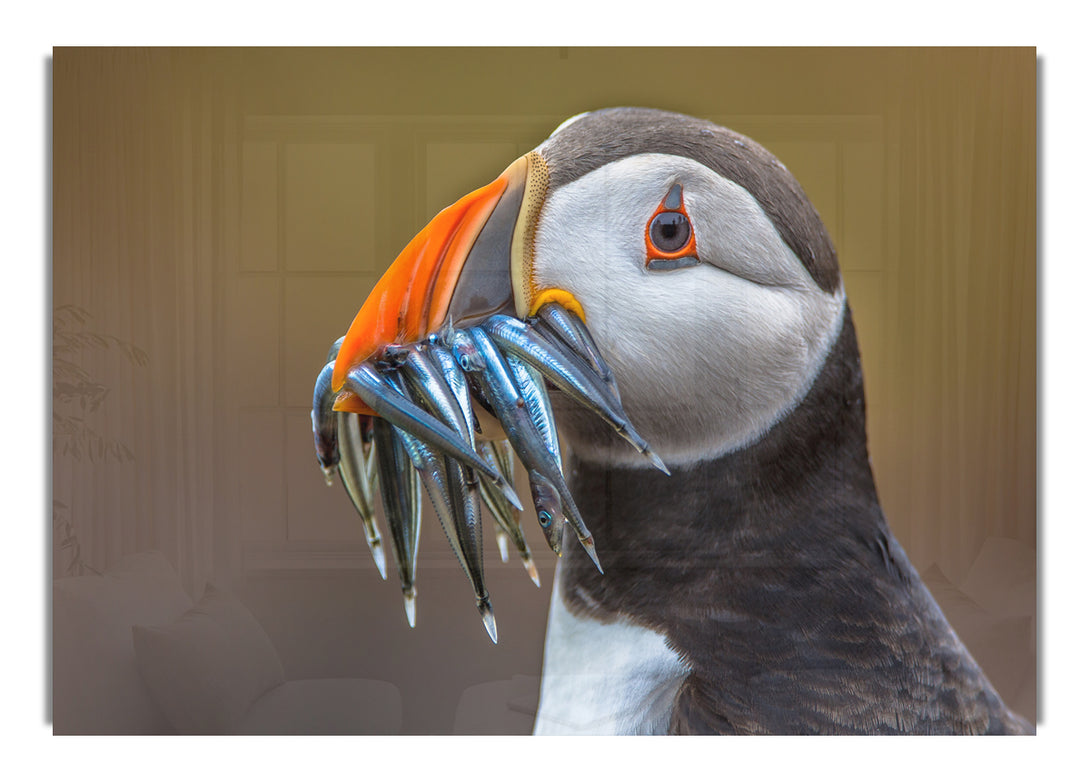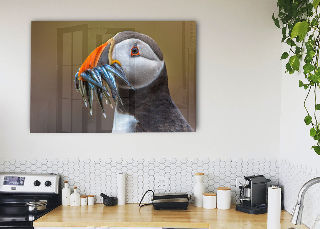 Puffin with a mouthall of fish acrylic print, UV printed onto 5mm thick acrylic glass. Comes with everything you need to hang on your wall.