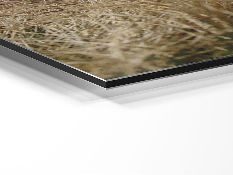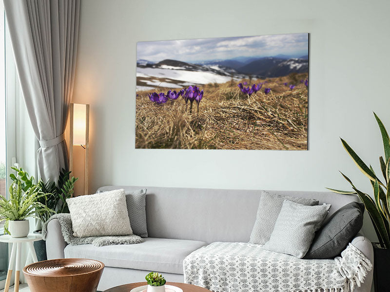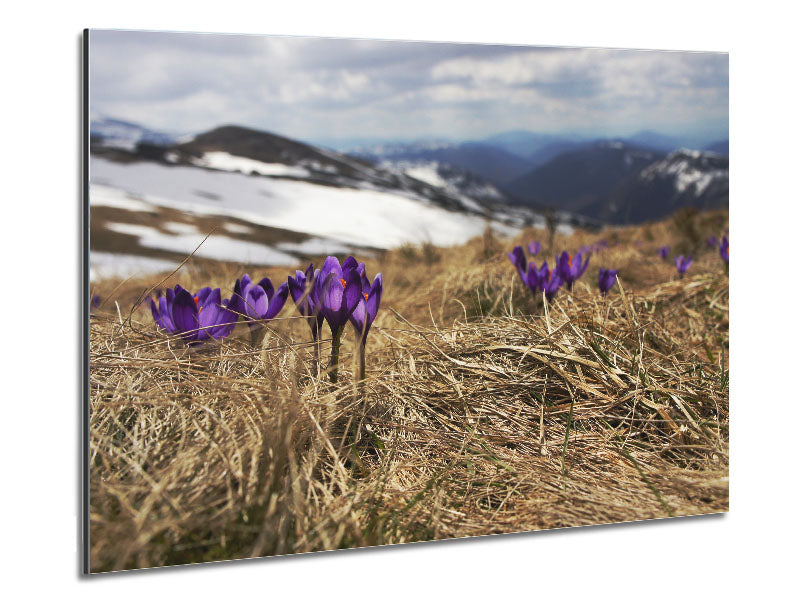 Purple crocus sprouting through the grass Printed on brushed aluminium dibond. A modern way to display art and easy to maintain.