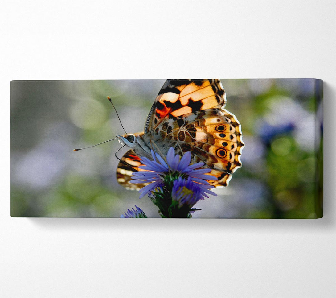 Purple Flower Butterfly canvas, printed on coated polyester canvas. Mounted on to a 44mm box frame, ready to hang.
