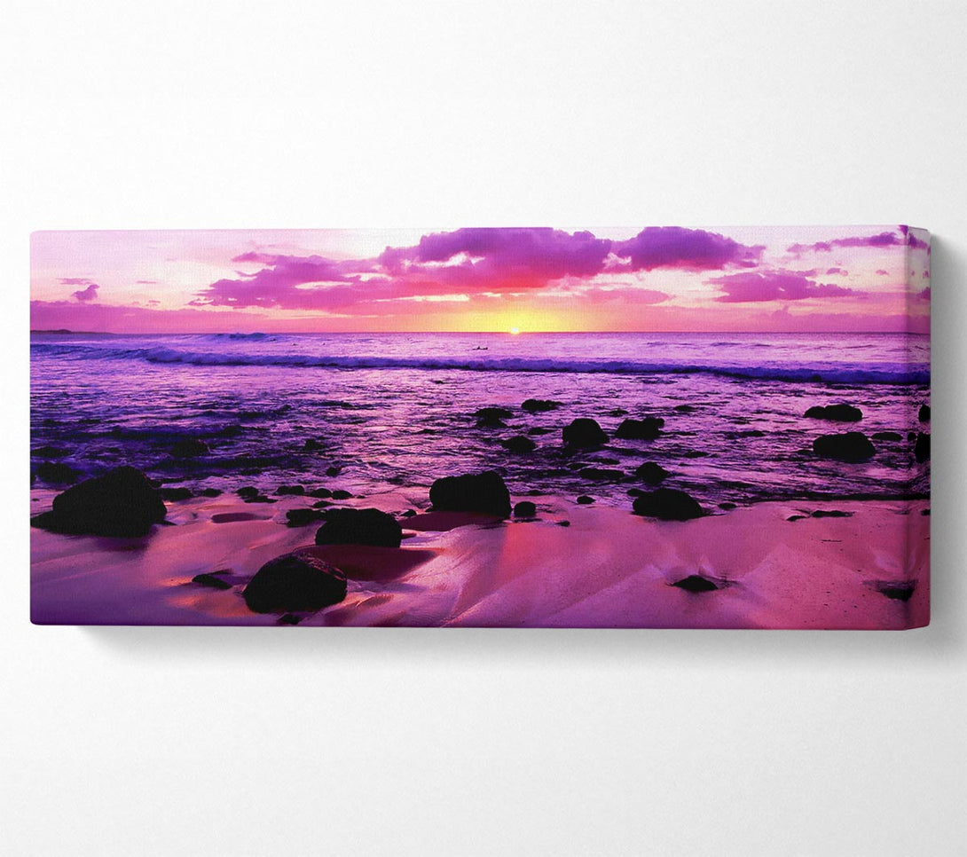 Purple Ocean Sunrise Rocks canvas, printed on coated polyester canvas. Mounted on to a 44mm box frame, ready to hang.