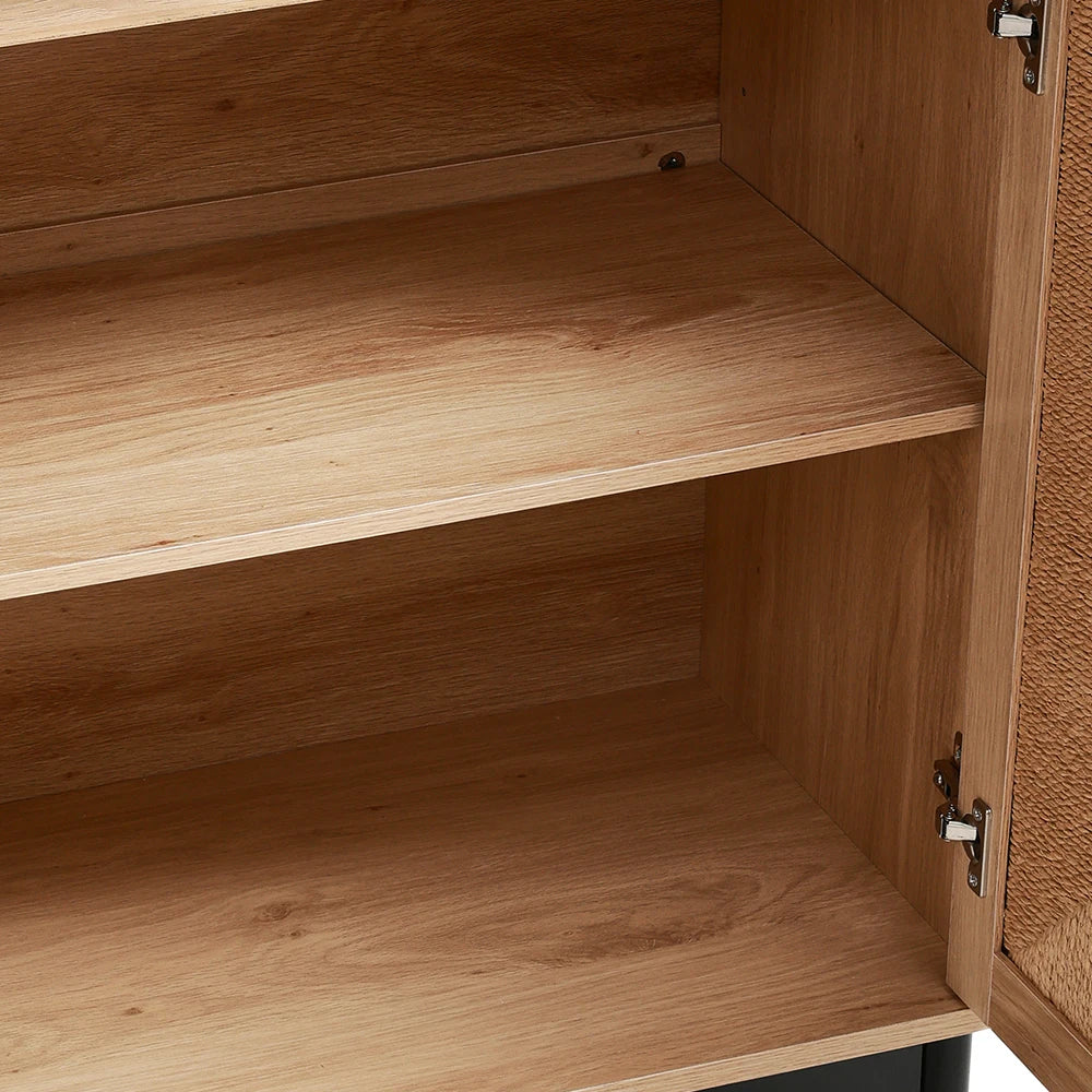 Crafted from high-quality wood, the sideboard features two handcrafted woven doors that exude rustic elegance. Behind the doors, you will find generous storage space to keep your belongings organized and easily accessible.