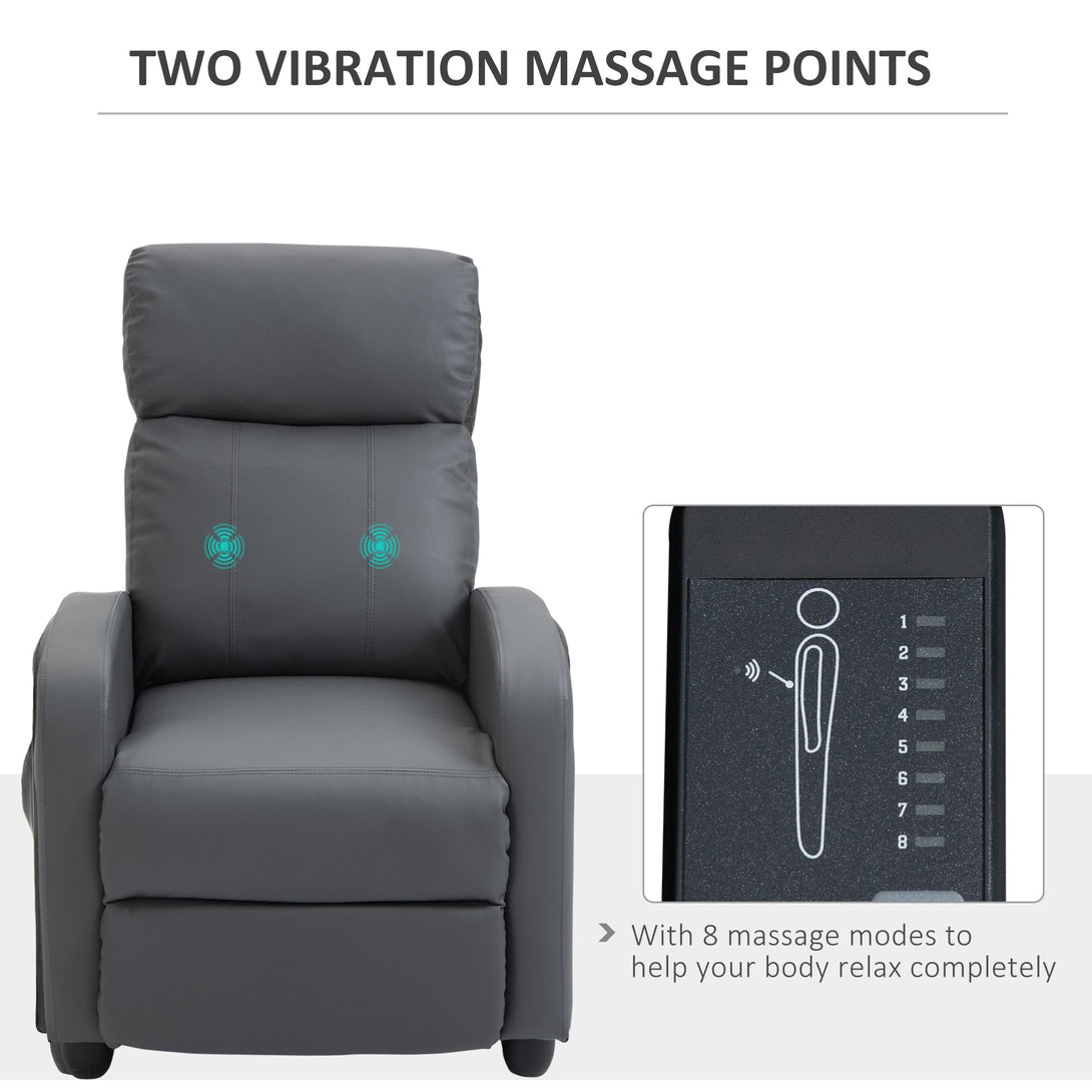 Let this reclining massage chair from HOMCOM take away stress and fatigue. Controlled by the included remote, it is fitted with two vibration massage points on the back, with eight different modes and five intensity levels to pick a setting which is most relaxing for you. The back manually goes back to maximum 150° so you can lean back and relax. It's filled with sponge for comfort, finished with smooth faux leather for a touch of timeless style.