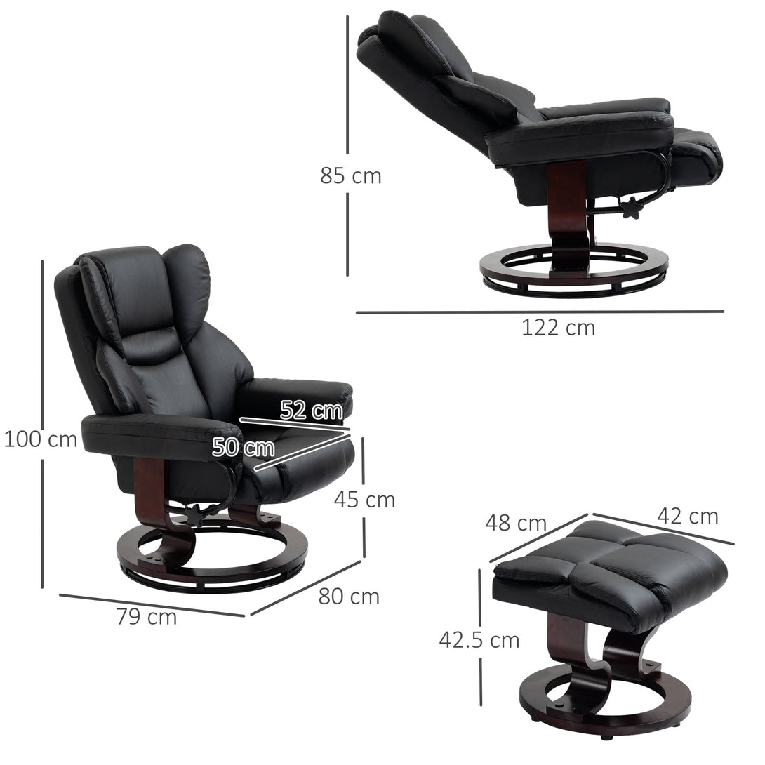 Reclining Swivel Armchair Footstool Set Sofa Padded PU Leather Relaxing Manual Duo Metal Frame Bentwood Base Black