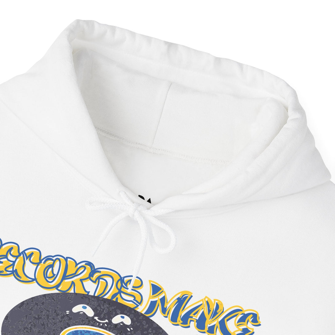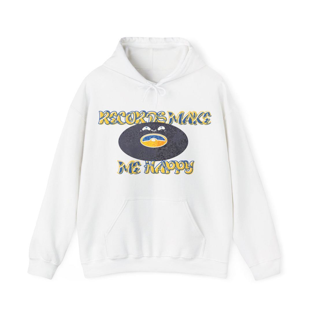 Records make me happy! Show your love for vinyl records with this fun and comfy hoodie. Made with a thick blend of cotton and polyester, it feels plush, soft and warm, a perfect choice for any cold day. In the front, the spacious kangaroo pocket adds daily practicality while the hood's drawstring is the same colour as the base sweater for extra style points.