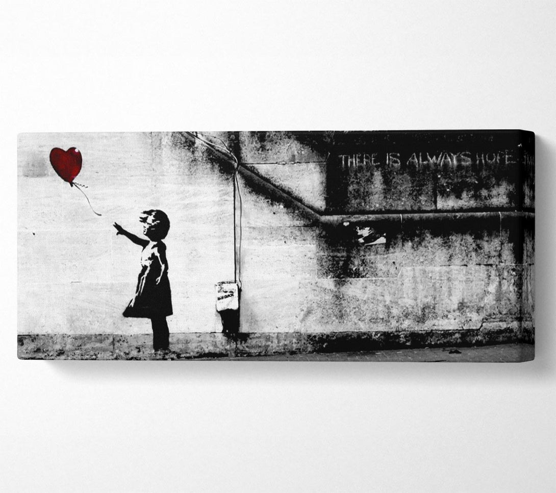 Red Heart Balloon Girl canvas, printed on coated polyester canvas. Mounted on to a 44mm box frame, ready to hang.