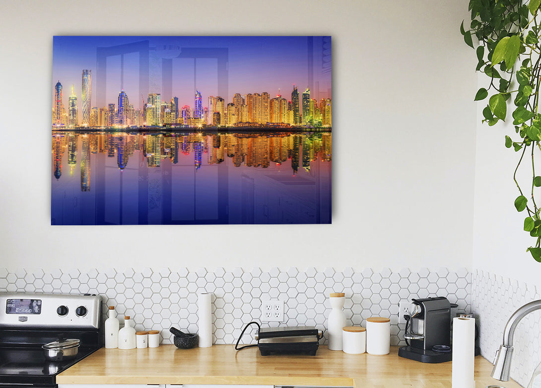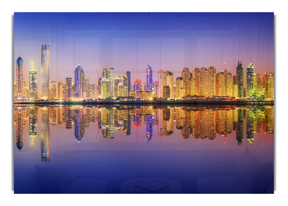 Reflections Of The Colourful City By Night acrylic print, UV printed onto 5mm thick acrylic glass. Comes with everything you need to hang on your wall.