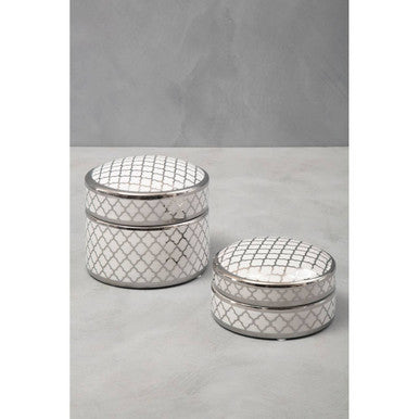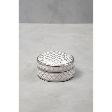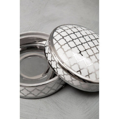 This large box is made from tactile ceramic, and has a glazed finish that adds to its reflective aesthetic. It features a silver quartefoil pattern on cool white, suitable for styling with geometric textiles and accessories.