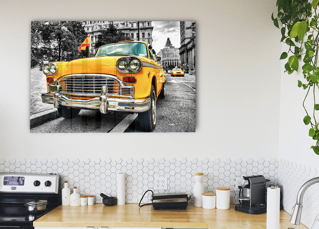 Retro Yellow Cab acrylic print, UV printed onto 5mm thick acrylic glass. Comes with everything you need to hang on your wall.