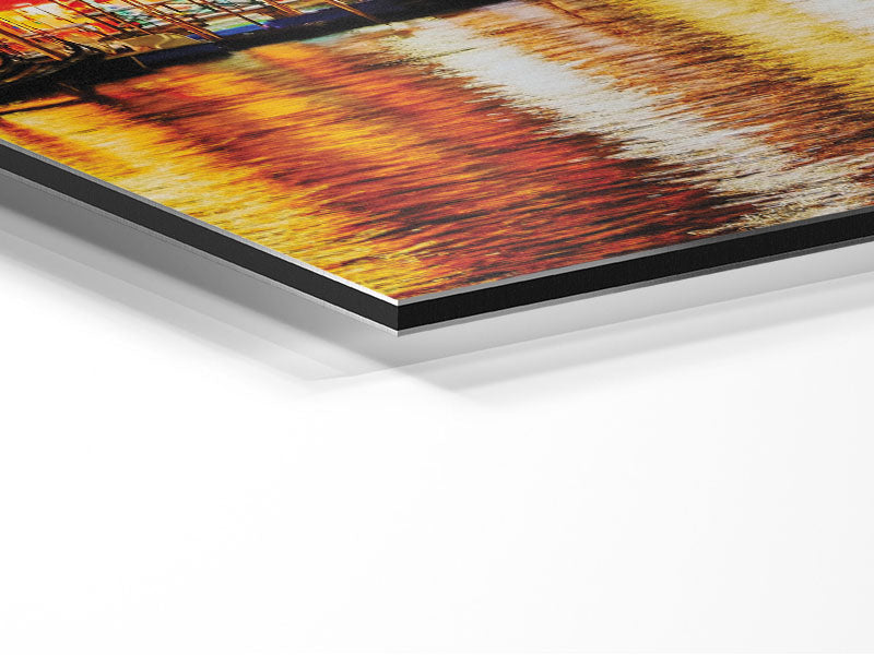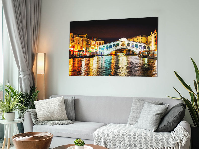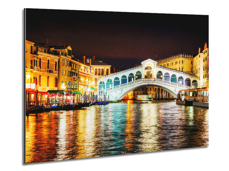 Rialto In Lights Printed on brushed aluminium dibond. A modern way to display art and easy to maintain.