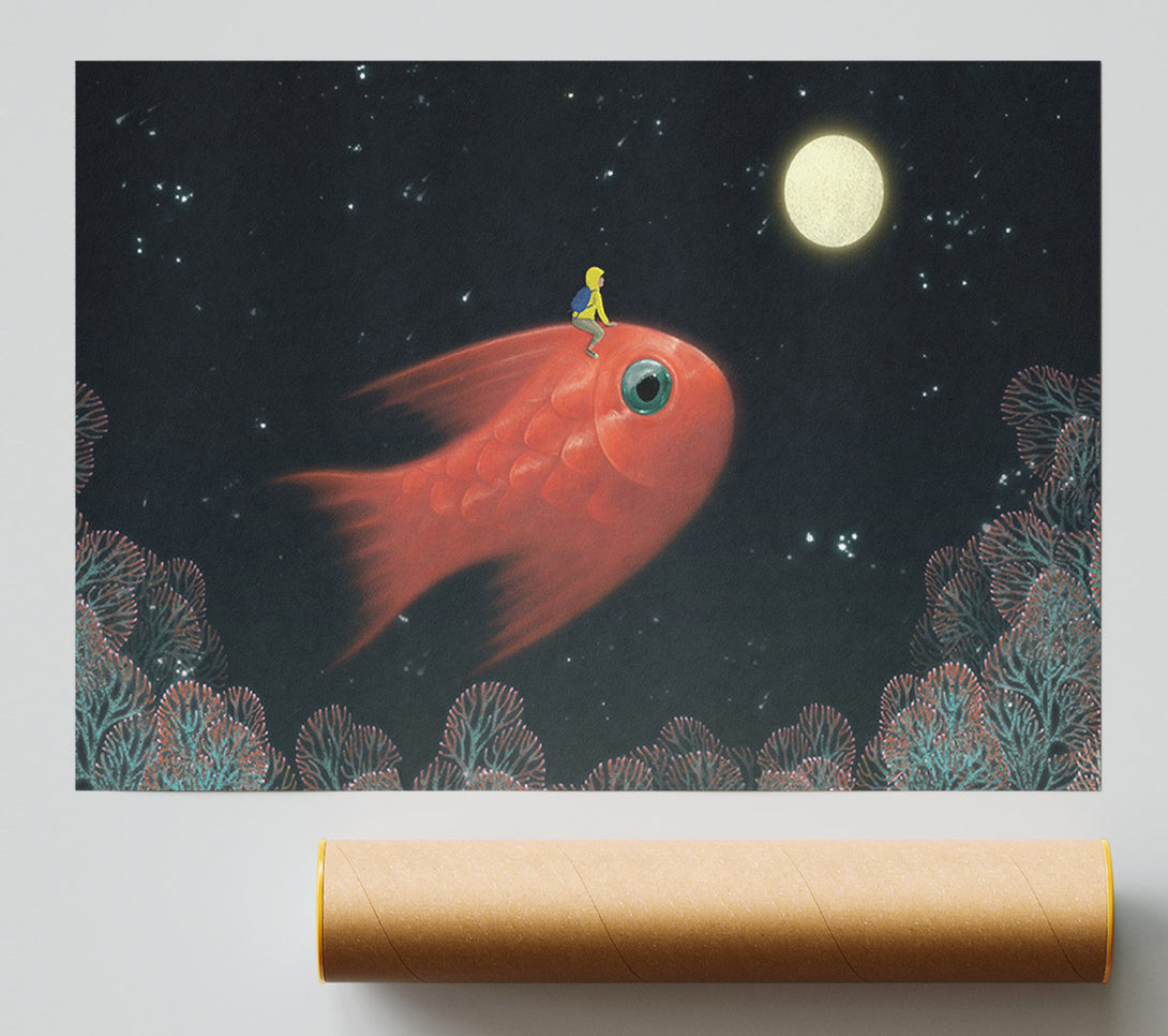Our Riding The Goldfish Poster is printed 260 GSM premium lustre paper that offers vibrant colours and exceptional detail.