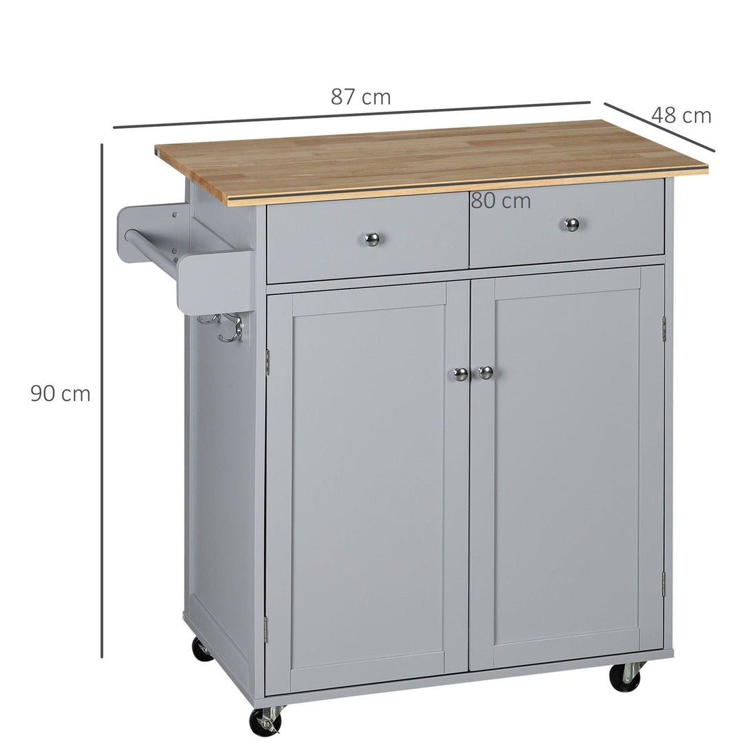 This prep & serving cart well fits limited spaces and can be moved to wherever you need it. 2 pull-out drawers, a double-door cabinet and a towel rack provide lots of space for supplies and accessories. Easy-roll wheels allow you to move wherever it is needed most. Solid rubberwood tabletop and MDF panels ensure sturdy construction and easy cleaning.