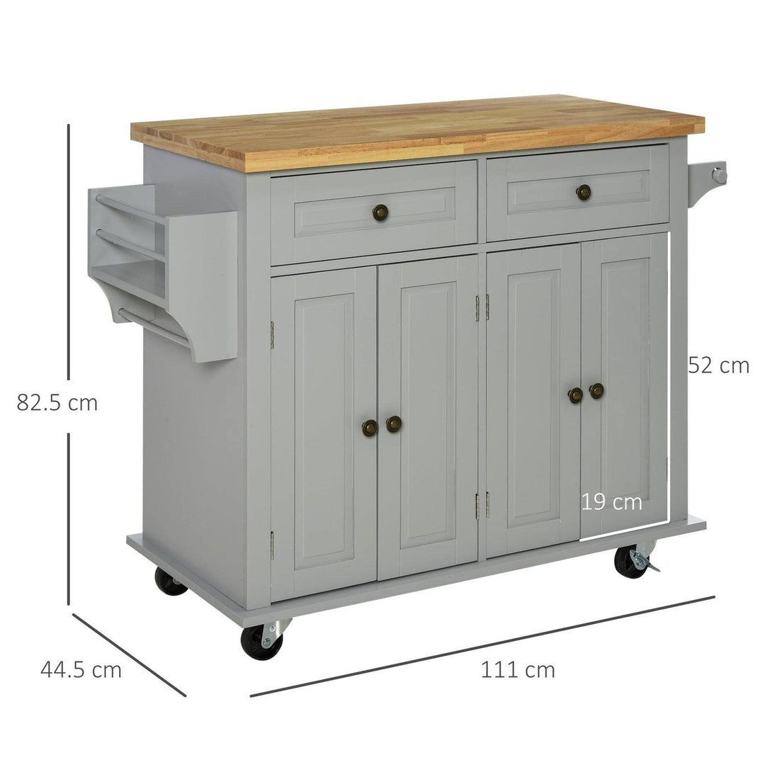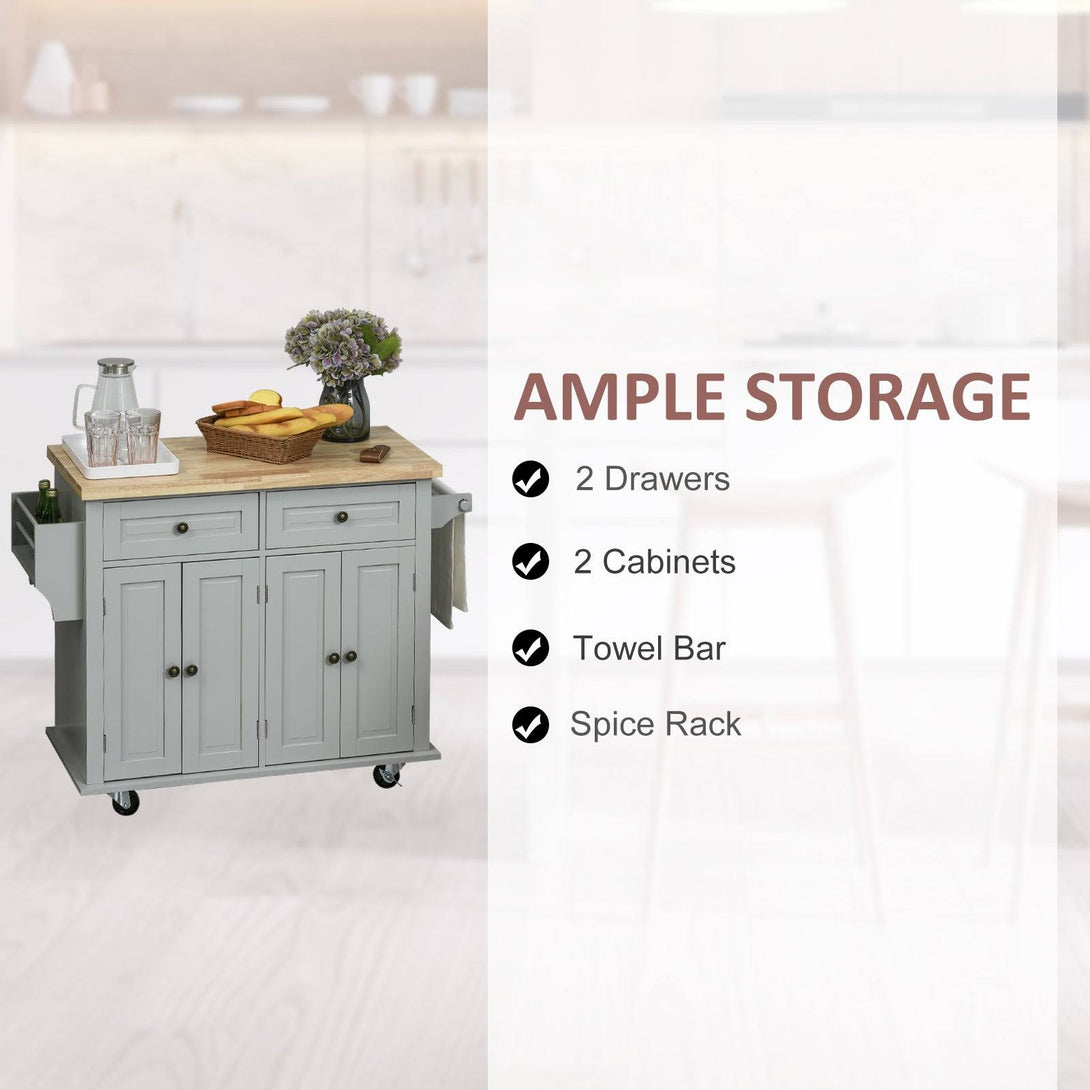 Rolling Kitchen Island Storage Trolley with Rubber Wood Top & Drawers for Dining Room