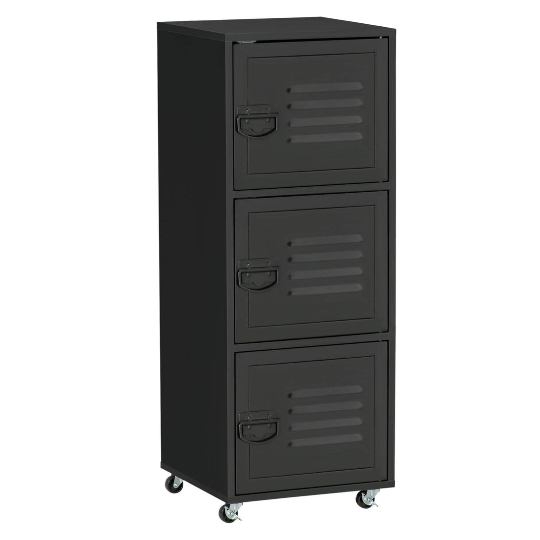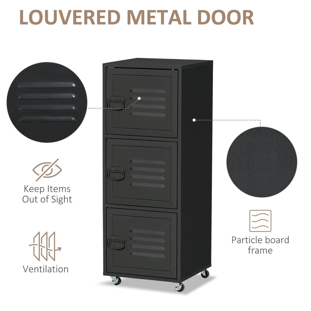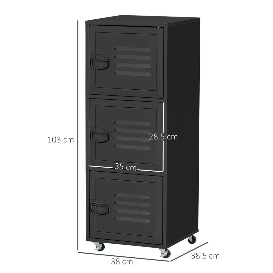Cool industrial edge for your home or office - this HOMCOM three-compartment cabinet is cool and quirky. It's a great piece to use as a storage cabinet, for those looking to do it differently this season and beyond. The structure, made from particle board is durable; each compartment is fitted with a metal door to keep inside guarded. Front air vents for freshness inside. Handle on the front to open the door easily. Completed with four wheels to move around easily.